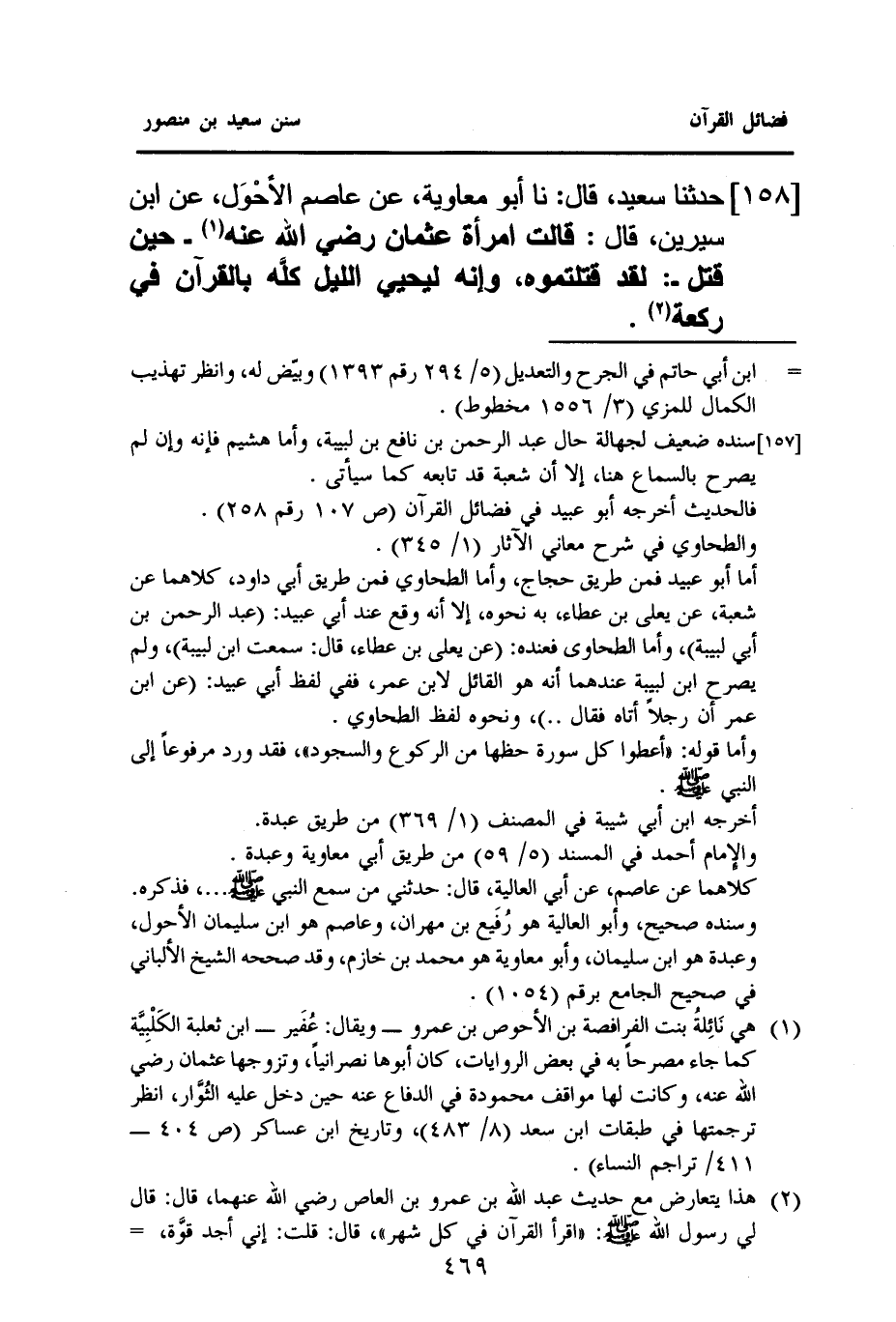 ١٥٨ - حَدَّثَنَا سَعِيدٌ، قَالَ: نا أَبُو مُعَاوِيَةَ، عَنْ عَاصِمٍ الأَحْوَل، عَنِ ابْنِ سِيرِينَ، قَالَ: قَالَتِ امْرَأَةُ عُثْمَانَ رَضِيَ اللَّهُ عَنْهُ (¬١) - حِينَ قُتِلَ -: لَقَدْ قَتَلْتُمُوهُ، وَإِنَّهُ لَيُحْيِي اللَّيْلَ كلَّه بِالْقُرْآنِ فِي رَكْعَةٍ (¬٢).