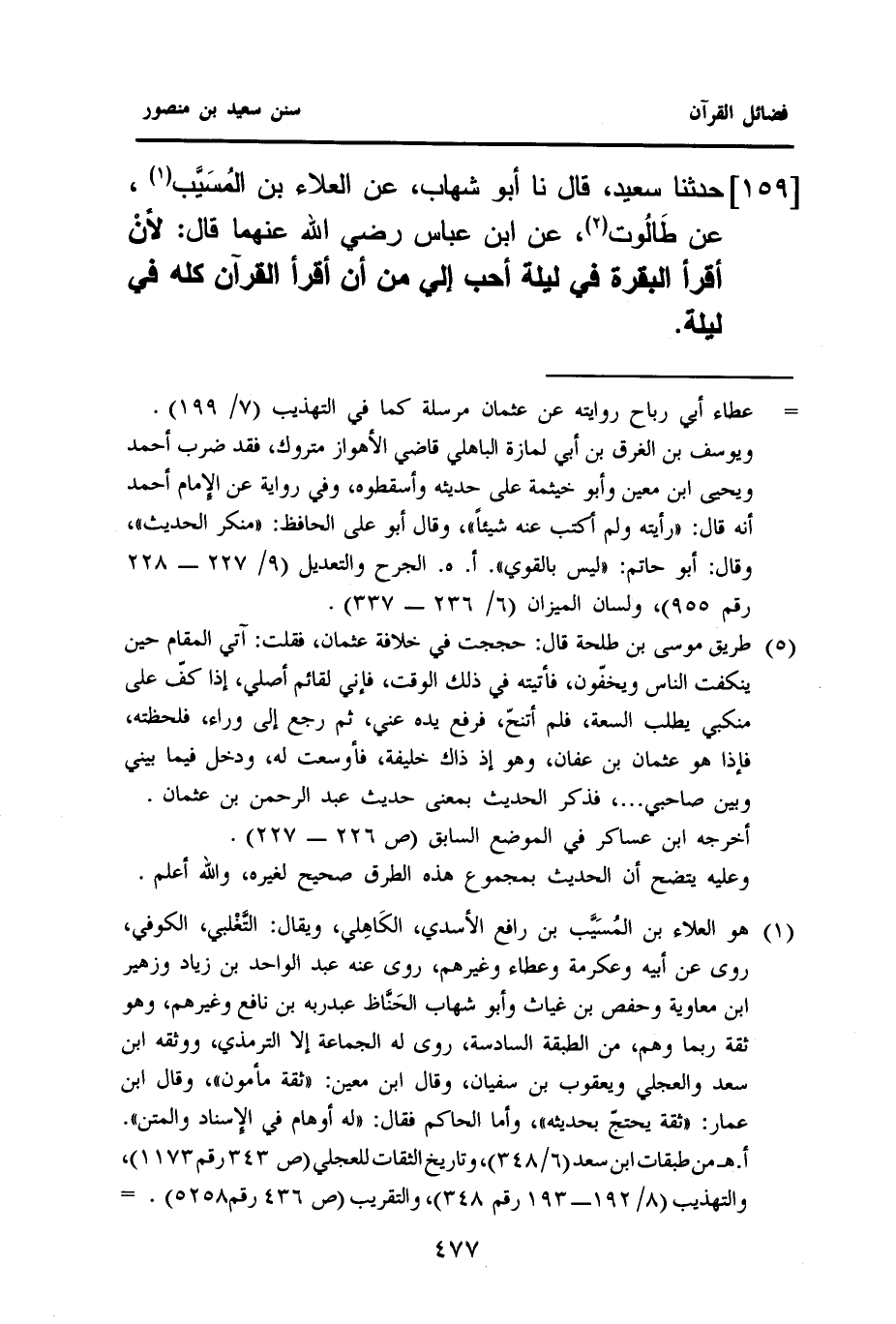 ١٥٩ - حَدَّثَنَا سَعِيدٌ، قَالَ: نا أَبُو شِهَابٍ، عَنِ الْعَلَاءِ بْنِ المُسَيَّب (¬١)، عَنْ طَالُوت (¬٢)، عَنِ ابْنِ عَبَّاسٍ رَضِيَ اللَّهُ عَنْهُمَا قَالَ: لأنْ أَقْرَأَ الْبَقَرَةَ فِي لَيْلَةٍ أَحَبُّ إِلَيَّ مِنْ أَنْ أَقْرَأَ الْقُرْآنَ كله في ليلة.