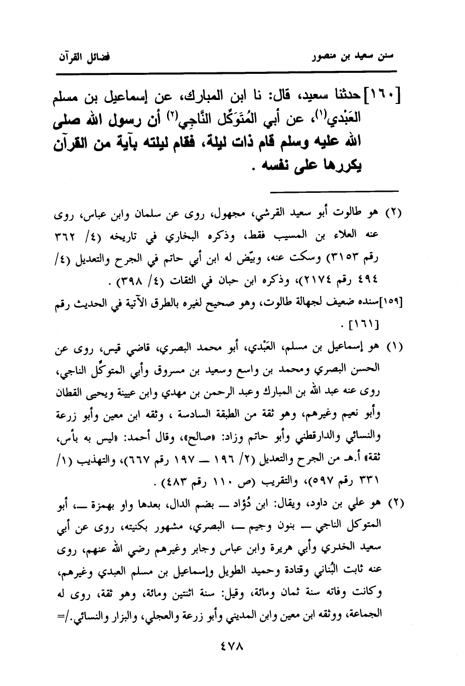 ١٦٠ - حَدَّثَنَا سَعِيدٌ، قَالَ: نا ابْنُ الْمُبَارَكِ، عَنْ إِسْمَاعِيلَ بْنِ مُسْلِمٍ العَبْدي (¬١)، عَنْ أَبِي المُتَوَكِّل النَّاجِي (¬٢) أَنَّ رَسُولَ اللَّهِ صَلَّى اللهُ عَلَيْهِ وَسَلَّمَ قَامَ ذَاتَ لَيْلَةٍ، فَقَامَ لَيْلَتَهُ بِآيَةٍ مِنَ الْقُرْآنِ يكررها على نفسه.