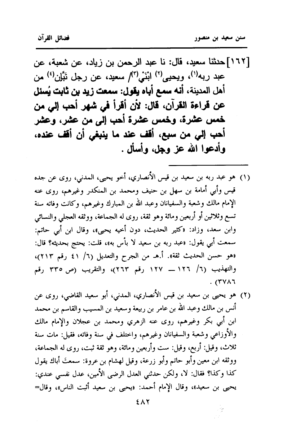 ١٦٢ - حَدَّثَنَا سَعِيدٌ، قَالَ: نا عَبْدُ الرَّحْمَنِ بْنُ زِيَادٍ، عَنْ شُعْبَةَ، عَنْ عَبْدِ رَبِّهِ (¬١)، وَيَحْيَى (¬٢) ابْنَيْ (¬٣) سَعِيدٍ، عَنْ رَجُلٍ تَبَّان (¬٤) مِنْ أَهْلِ الْمَدِينَةِ، أَنَّهُ سَمِعَ أَبَاهُ يَقُولُ: سَمِعْتُ زَيْدَ بْنَ ثَابِتٍ يُسأل عَنْ قِرَاءَةِ الْقُرْآنِ، قَالَ: لَأَنْ أَقْرَأَ فِي شَهْرٍ أَحَبُّ إِلَيَّ مِنْ خَمْسَ عَشْرَةَ، وَخَمْسَ عَشْرَةَ أَحَبُّ إِلَيَّ مِنْ عَشْرٍ، وَعَشْرٌ أَحَبُّ إِلَيَّ مِنْ سَبْعٍ , أَقِفُ عِنْدَ مَا يَنْبَغِي أَنْ أَقِفَ عِنْدَهُ، وَأَدْعُوا اللَّهَ عَزَّ وجل وأسأل.