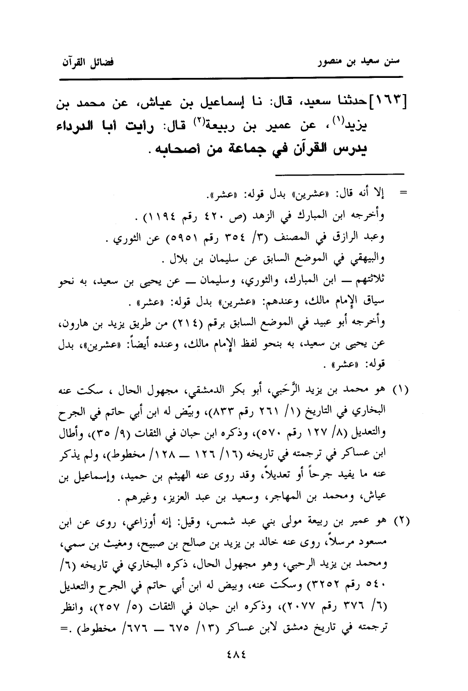١٦٣ - حَدَّثَنَا سَعِيدٌ، قَالَ: نا إِسْمَاعِيلُ بْنُ عَيَّاشٍ، عَنْ مُحَمَّدِ بْنِ يَزِيدَ (¬١)، عَنْ عُمَيْرِ بْنِ رَبِيعَةَ (¬١)، قَالَ: رَأَيْتُ أَبَا الدَّرْدَاءِ يَدْرُسُ الْقُرْآنَ فِي جَمَاعَةٍ مِنْ أَصْحَابِهِ.