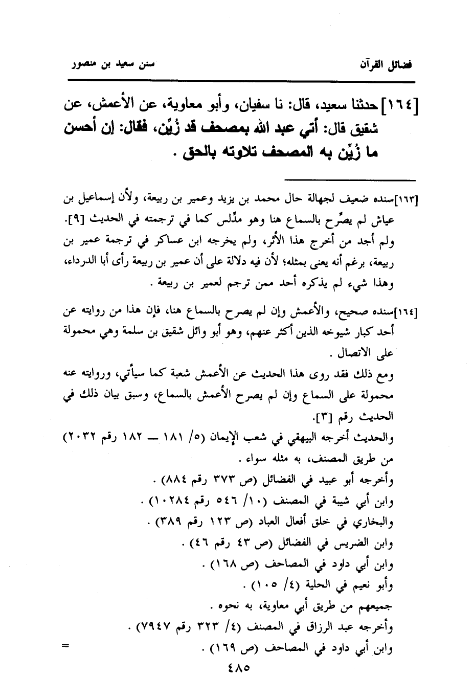 ١٦٤- حَدَّثَنَا سَعِيدٌ، قَالَ: نا سُفْيَانُ، وَأَبُو مُعَاوِيَةَ، عَنِ الْأَعْمَشِ، عَنْ شَقِيقٍ، قَالَ: أُتِيَ عَبْدُ اللَّهِ بِمُصْحَفٍ قَدْ زُيِّن، فَقَالَ: إِنَّ أَحْسَنَ مَا زُيِّن بِهِ الْمُصْحَفُ تلاوته بالحق.