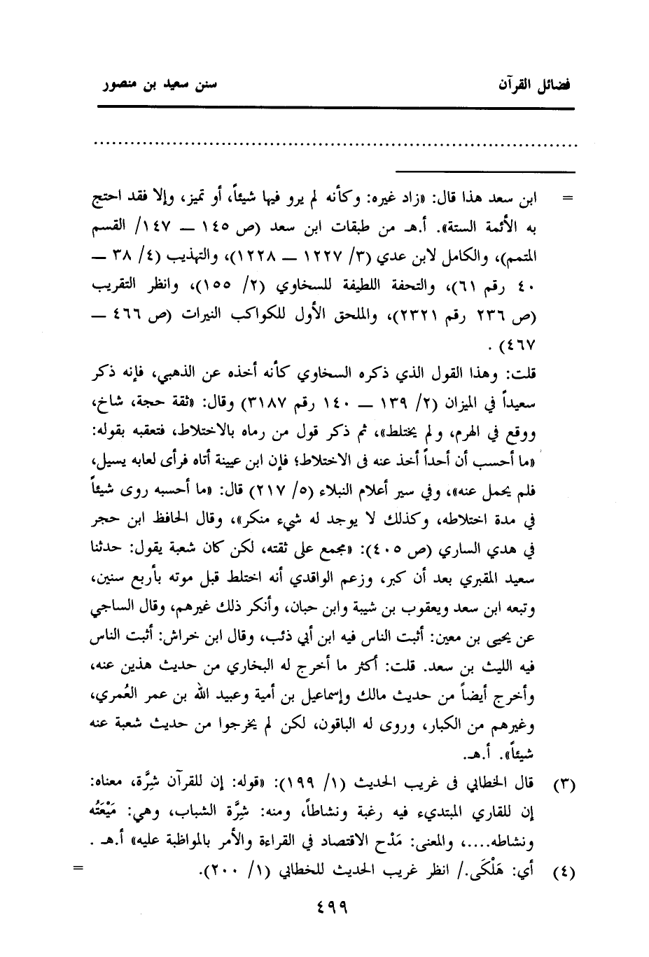 قلت: وهذا القول ذكره السخاوي كأنه أخذه عن الذهبي، فإنه ذكر سعيدًا في "الميزان" (٢/ ١٣٩ - ١٤٠ رقم ٣١٨٧) وقال: ((ثقة حجة، شاخ، ووقع في الهرم، ولم يختلط))، ثم ذكر قول من رماه بالاختلاط، فتعقبه بقوله: ((ما أحسب أن أحدًا أخذ عنه في الاختلاط؛ فإن ابن عيينة أتاه فرأى لعابه يسيل، فلم يحمل عنه))، وفي "سير أعلام النبلاء" (٥/ ٢١٧) قال: ((ما أحسبه روى شيئًا في مدة اختلاطه، وكذلك لا يوجد له شيء منكر))، وقال الحافظ ابن حجر في "هدي الساري" (ص ٤٠٥): ((مجمع على ثقته، لكن كان شعبة يقول: حدثنا سعيد المقبري بعد أن كبر، وزعم الواقدي أنه اختلط قبل موته بأربع سنين، وتبعه ابن سعد ويعقوب بن شيبة وابن حبان، وأنكر ذلك غيرهم، وقال الساجي عن يحيى بن معين: أثبت الناس فيه ابن أبي ذئب، وقال ابن خراش: أثبت الناس فيه الليث بن سعد. قلت: أكثر ما أخرج له البخاري من حديث هذين عنه، وأخرج أيضًا من حديث مالك وإسماعيل بن أمية وعبيد الله بن عمر العُمري، وغيرهم من الكبار، وروى له الباقون، لكن لم يخرجوا من حديث شعبة عنه شيئًا)). اهـ.