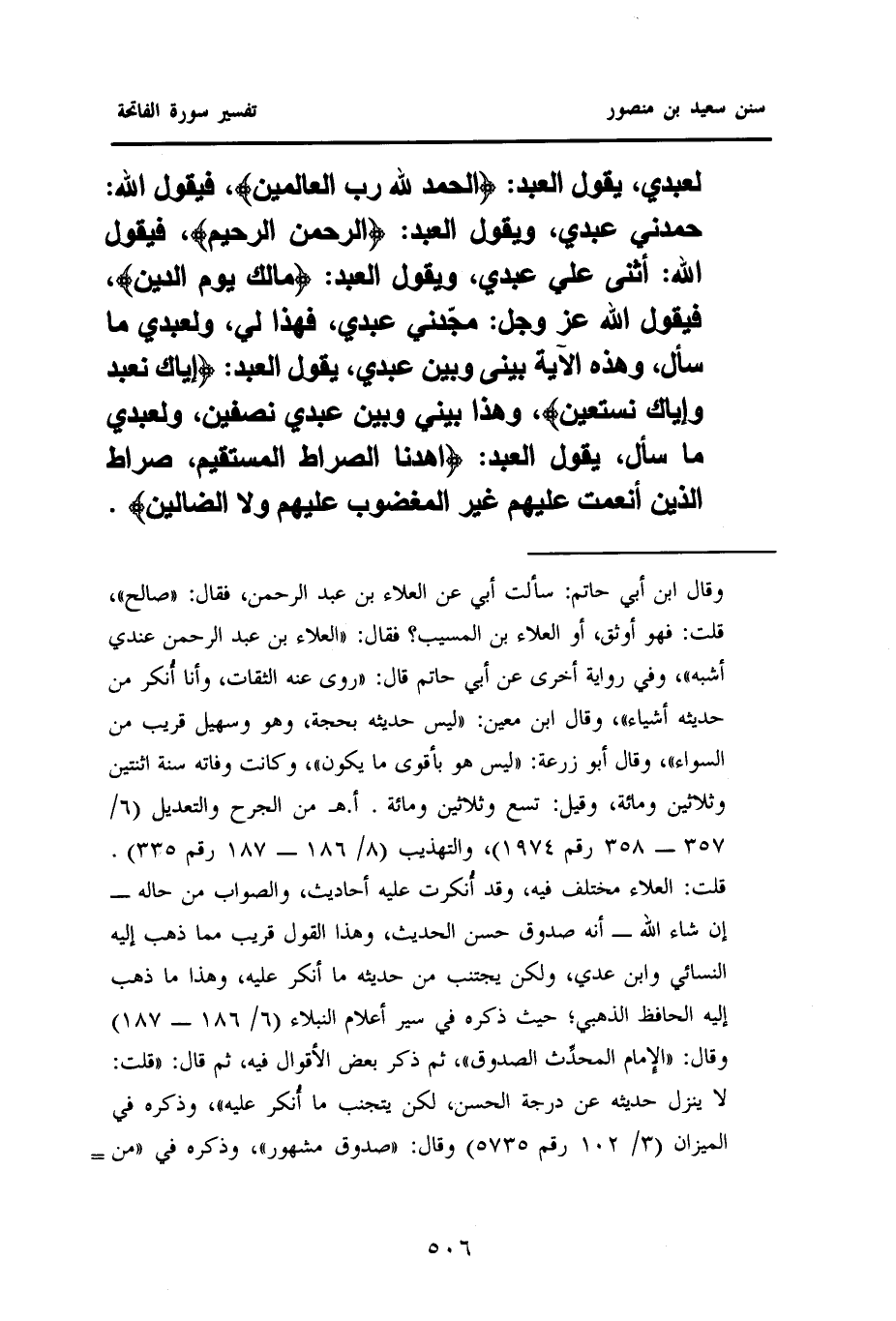 = وقال ابن أبي حاتم: سألت أبي عَنِ الْعَلَاءِ بْنِ عَبْدِ الرَّحْمَنِ، فقال: ((صالح))، قلت: فهو أوثق، أو العلاء بن المسيب؟ فقال: ((العلاء بن عبد الرحمن عندي أشبه))، وفي رواية أخرى عن أبي حاتم قال: ((روى عن الثقات، وأنا أُنكر من حديثه أشياء، وقال ابن معين: ((ليس حديثه بحجة، وهو وسهيل قريب من السواء))، وقال أبو زرعة: ((ليس هو بأقوى ما يكون))، وكانت وفاته سنة اثنتين وثلاثين ومائة، وقيل: تسع وثلاثين ومائة. اهـ. من "الجرح والتعديل" (٦/ ٣٥٧ - ٣٥٨ رقم ١٩٧٤)، و"التهذيب" (٨/ ١٨٦ - ١٨٧ رقم ٣٣٥).