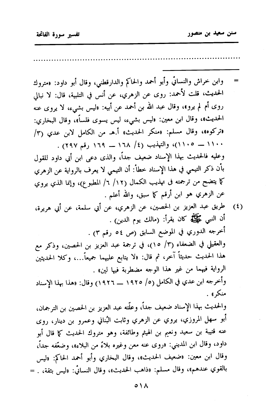 (٤) طريق عبد العزيز بن الحصين، عن الزهري، عن أبي سلمة، عَنْ أَبِي هُرَيْرَةَ، أَنَّ النَّبِيَّ - صَلَّى اللهُ عَلَيْهِ وَسَلَّمَ - كَانَ يقرأ: (مالك يوم الدين).