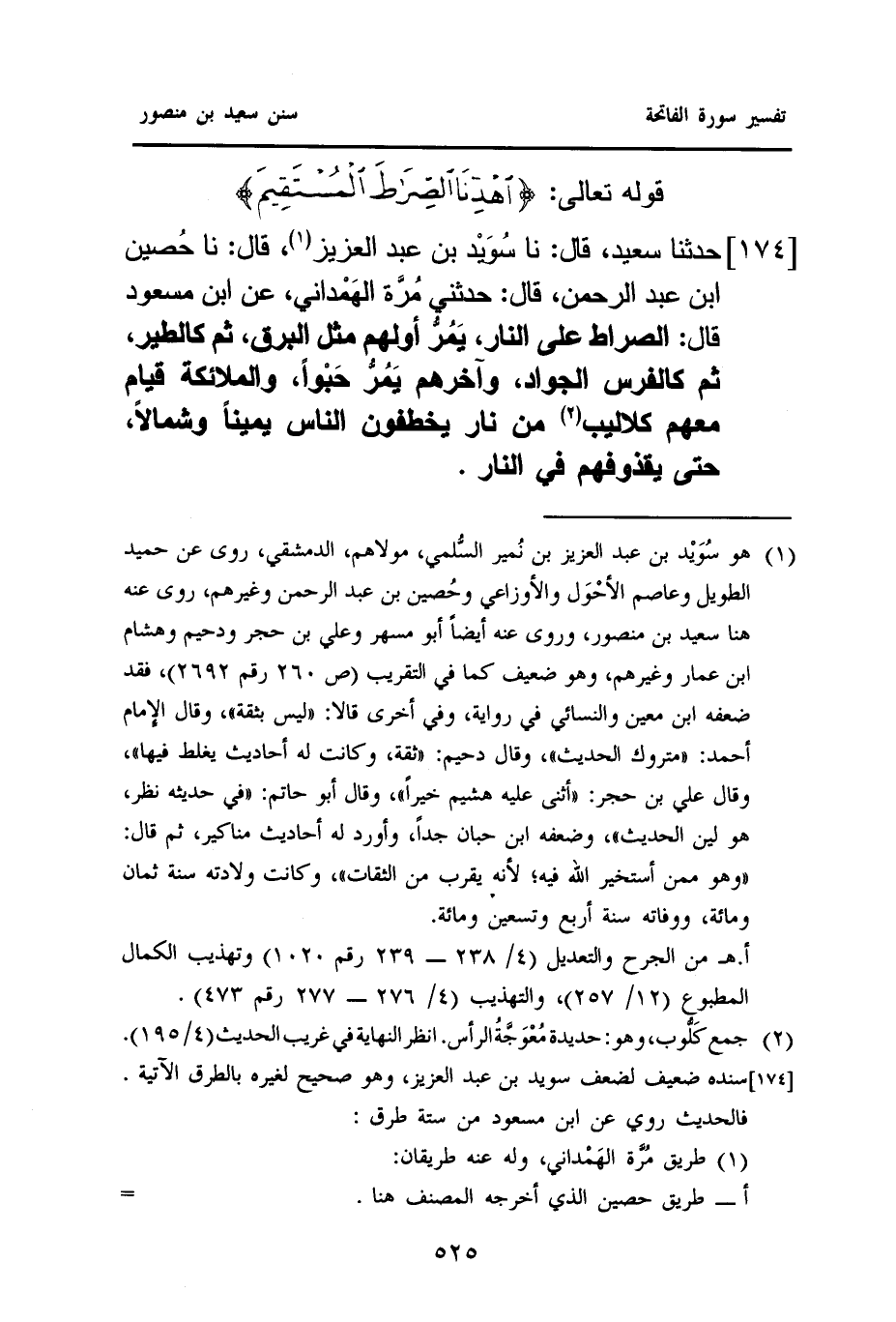 ١٧٤ - حَدَّثَنَا سَعِيدٌ، قَالَ: نا سُوَيْدُ بْنُ عَبْدِ الْعَزِيزِ (¬١)، قَالَ: نا حُصين بْنُ عَبْدِ الرَّحْمَنِ، قَالَ: حَدَّثَنِي مُرَّة الْهَمْدَانِيُّ، عَنِ ابْنِ مَسْعُودٍ قَالَ: الصِّرَاطُ عَلَى النَّارِ، يَمُرُّ أولِهم مِثْلَ الْبَرْقِ، ثُمَّ كَالطَّيْرِ، ثُمَّ كَالْفَرَسِ الْجَوَادِ، وَآخِرُهُمْ يَمُرُّ حَبْوًا، وَالْمَلَائِكَةُ قِيَامٌ مَعَهُمْ كَلَالِيبُ (¬٢) مِنْ نَارٍ، يَخْطَفُونَ النَّاسَ يَمِينًا وَشِمَالًا، حَتَّى يَقْذِفُوهُمْ فِي النار.