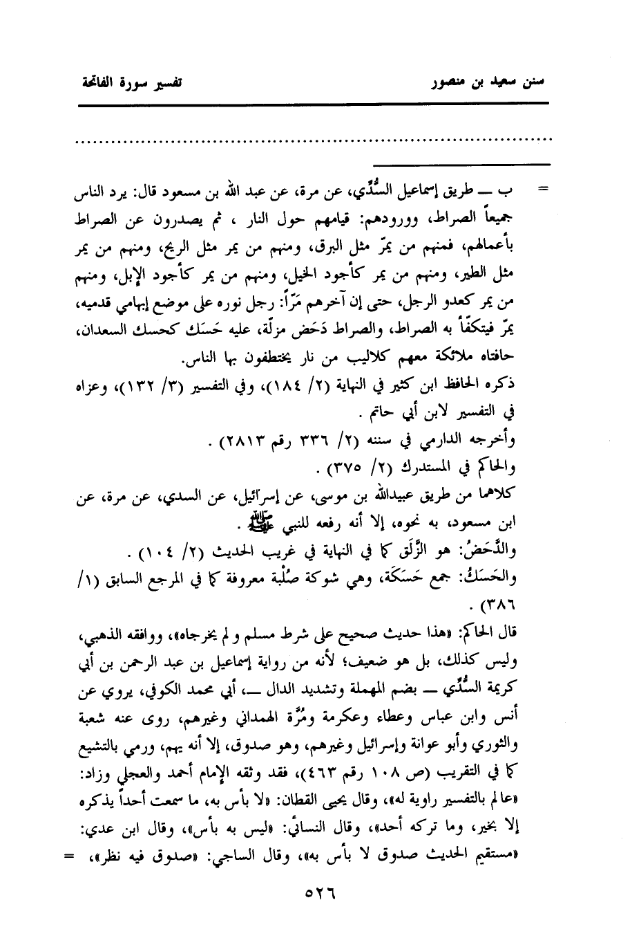 = ب- طريق إسماعيل السُّدِّي، عَنْ مُرَّةَ، عَنْ عَبْدِ اللَّهِ بن مسعود قال: يرد الناس جميعًا الصراط، ووردهم: قيامهم حول النار، ثم يصدرون عن الصراط بأعمالهم، فمنهم من يمرّ مثل البرق، ومنهم من يمر مثل الريح، ومنهم من يمر مثل الطير، ومنهم من يمر كأجود الخيل، ومنهم من يمر كأجود الإبل، ومنهم من يمر كعدو الرجل، حتى إن آخرهم مَرًّا: رجل نوره على موضع إبهامي قدميه، يمرّ فيتكفّأ به الصراط، والصراط دَحَض مزلَّة، عليه حَسَك كحسك السعدان، حافتاه ملائكة معهم كلاليب من نار يختطفون بها الناس.