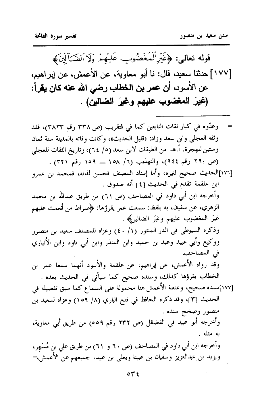 ١٧٧- حَدَّثَنَا سَعِيدٌ، قَالَ: نا أَبُو مُعَاوِيَةَ، عَنِ الْأَعْمَشِ، عَنْ إِبْرَاهِيمَ، عَنِ الْأَسْوَدِ، أَنَّ عُمَرَ بْنُ الْخَطَّابِ رَضِيَ اللَّهُ عَنْهُ كَانَ يَقْرَأُ: (غيرَ الْمَغْضُوبِ عَلَيْهِمْ وغيرَ الضالين) .