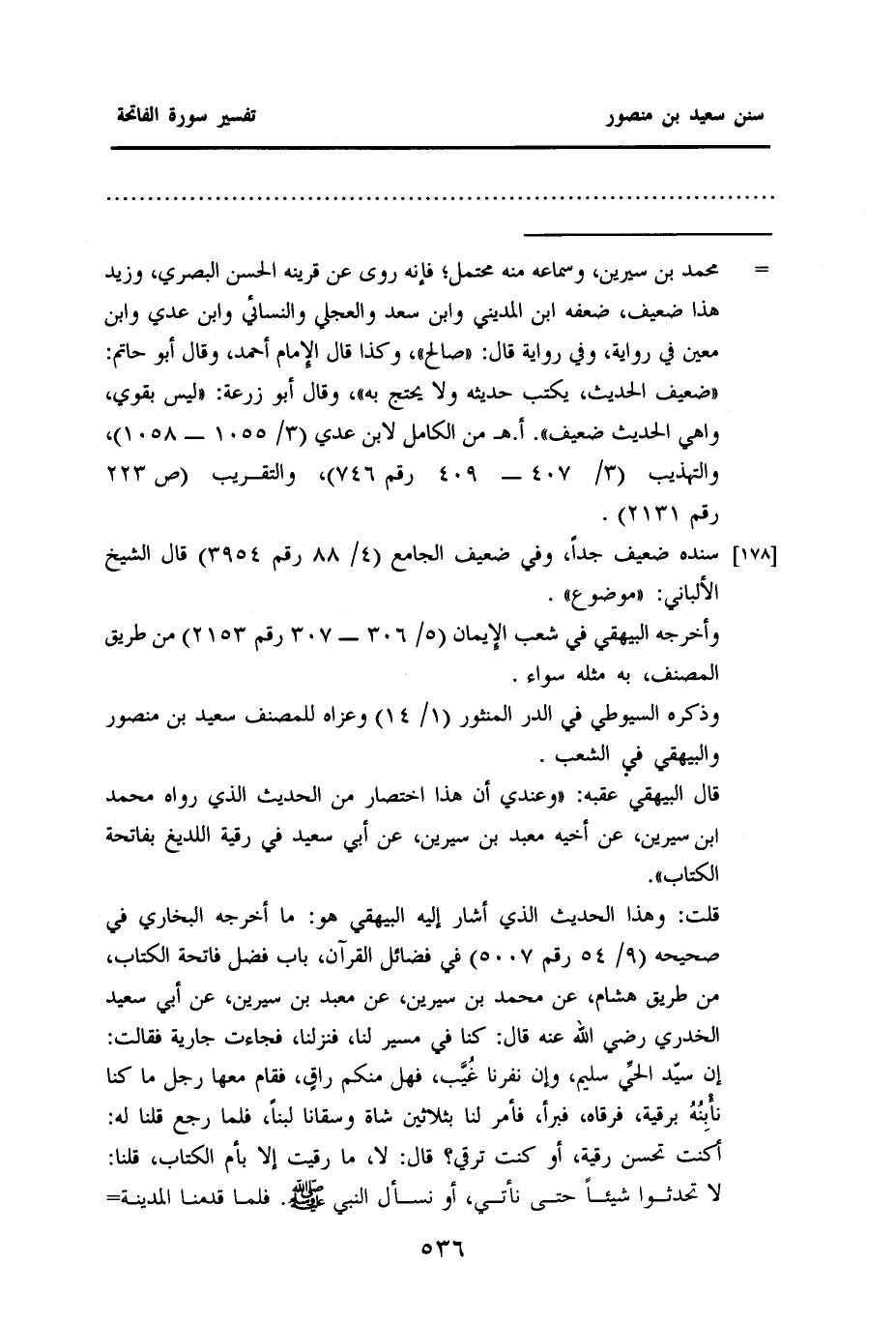 قال البيهقي عقبه: ((وعندي أن هذا اختصار من الحديث الذي رواه محمد بن سيرين، عن أخيه معبد بن سيرين، عن أبي سعيد في رقية اللديغ بفاتحة الكتاب)) .