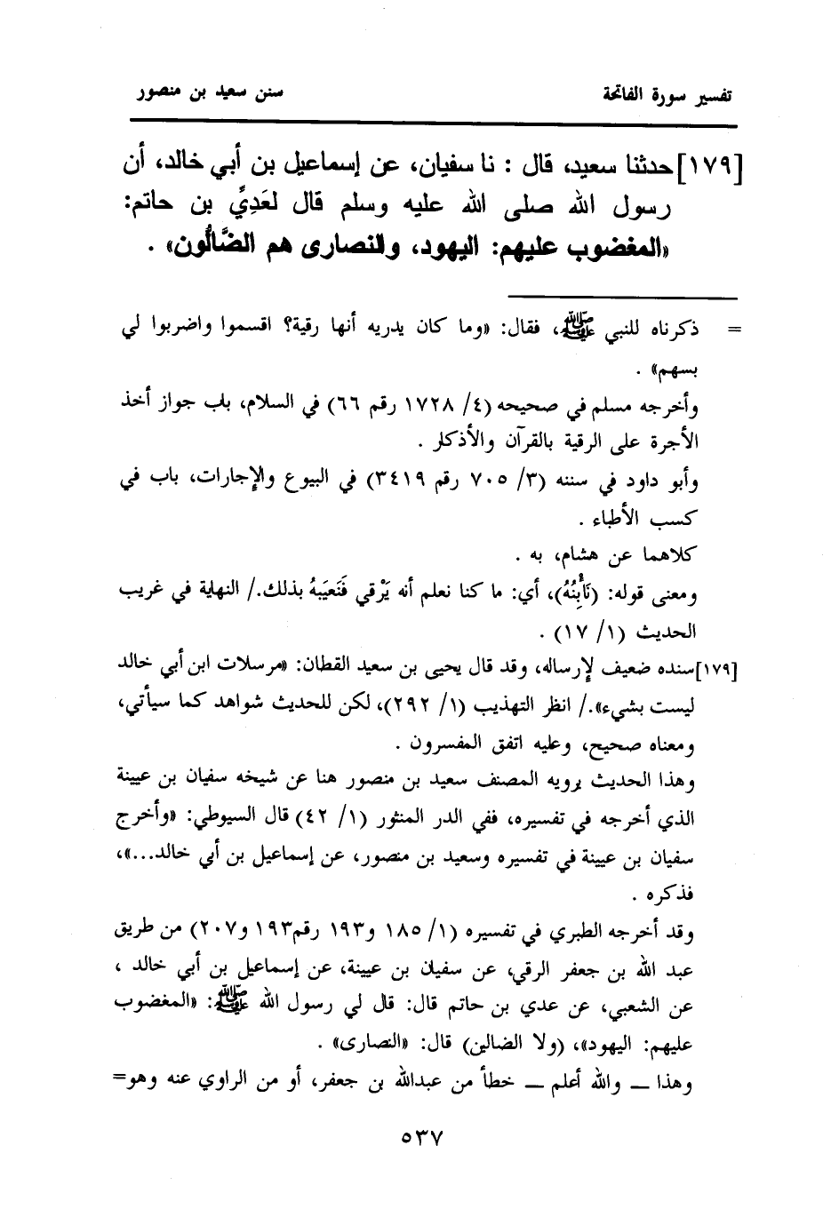 ١٧٩- حَدَّثَنَا سَعِيدٌ، قَالَ: نا سُفْيَانُ، عَنْ إِسْمَاعِيلَ بْنِ أَبِي خَالِدٍ، أَنَّ رَسُولَ اللَّهِ صَلَّى اللهُ عَلَيْهِ وَسَلَّمَ قَالَ لعَدِيِّ بْنِ حَاتِمٍ: ((الْمَغْضُوبُ عَلَيْهِمُ: الْيَهُودُ، وَالنَّصَارَى هم الضَّالُّون)) .