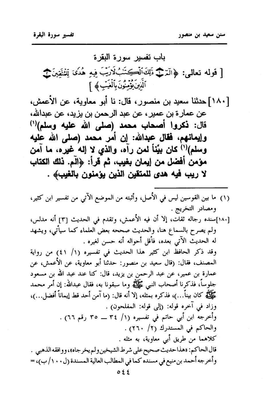 ١٨٠ - حَدَّثَنَا سَعِيدُ بْنُ مَنْصُورٍ، قَالَ: نا أَبُو مُعَاوِيَةَ، عَنِ الْأَعْمَشِ، عَنْ عُمَارَةَ بْنِ عُمَيْرٍ، عَنْ عَبْدِ الرَّحْمَنِ بْنِ يَزِيدَ، عَنِ عَبْدِ اللَّهِ، قَالَ: ذَكَرُوا أَصْحَابَ مُحَمَّدٍ (صَلَّى اللهُ عَلَيْهِ وَسَلَّمَ) (¬١) وَإِيمَانَهُمْ، فَقَالَ عَبْدُ اللَّهِ: إِنَّ أَمْرَ مُحَمَّدٍ (صَلَّى اللهُ عَلَيْهِ وَسَلَّمَ) (¬١) كَانَ بيِّنًا لِمَنْ رَآهُ، وَالَّذِي لَا إِلَهَ غَيْرُهُ، مَا آمَنَ مُؤْمِنٌ أَفْضَلَ مِنْ إِيمَانٍ بِغَيْبٍ، ثُمَّ قَرَأَ: {الم * ذَلِكَ الْكِتَابُ لَا رَيْبَ فِيهِ هُدًى لِلْمُتَّقِينَ * الَّذِينَ يُؤْمِنُونَ بِالْغَيْبِ}.