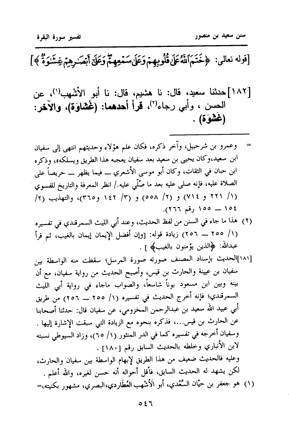١٨٢ - حَدَّثَنَا سَعِيدٌ؛ قَالَ: نا هُشَيْمٌ، قَالَ: نا أَبُو الأشْهب (¬١)، عَنِ الْحَسَنِ، وَأَبِي رَجَاءٍ (¬٢)، قَرَأَ أَحَدُهُمَا: (غُشَاوَة) والآخر: (غَشْوَة).