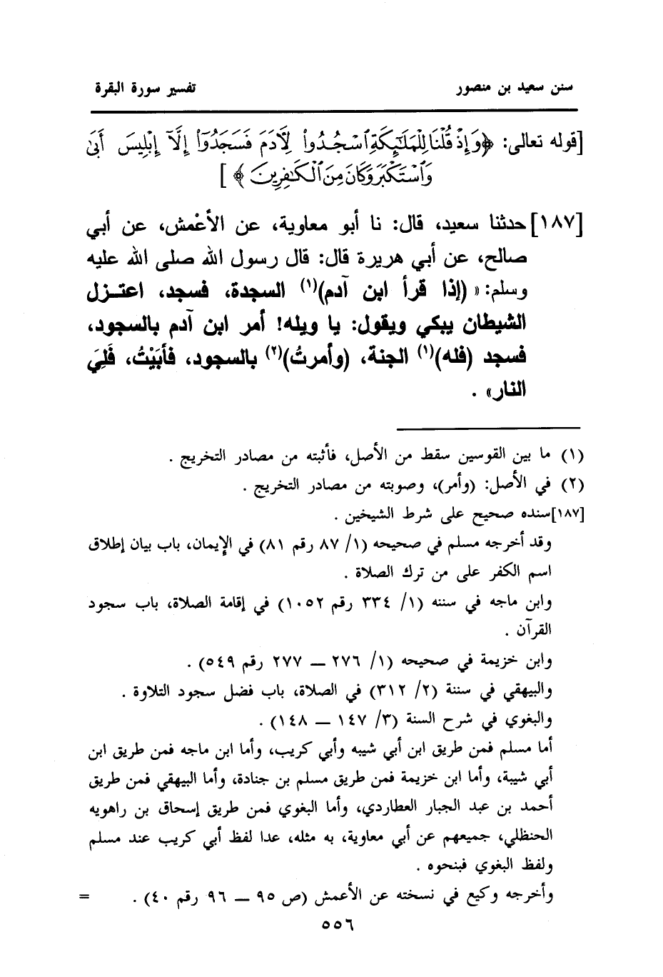 ١٨٧ - حَدَّثَنَا سَعِيدٌ، قَالَ: نا أَبُو مُعَاوِيَةَ، عَنِ الأَعْمش، عَنْ أَبِي صَالِحٍ، عَنْ أَبِي هُرَيْرَةَ، قَالَ: قَالَ رَسُولُ اللَّهِ صَلَّى اللهُ عَلَيْهِ وَسَلَّمَ: (((إِذَا قَرَأَ ابْنُ آدَمَ) (¬١) السَّجْدَةَ، فَسَجَدَ، اعْتَزَلَ الشَّيْطَانُ يَبْكِي وَيَقُولُ: يَا وَيْلَهُ! أُمِرَ ابْنُ آدَمَ بِالسُّجُودِ، فَسَجَدَ، (فَلَهُ) (¬١) الْجَنَّةُ، (وأمرتُ) (¬٢) بِالسُّجُودِ، فأَبَيْتُ، فَلِيَ النار)).