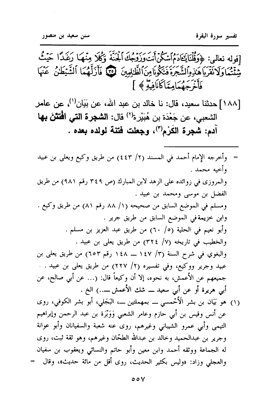 ١٨٨ - حَدَّثَنَا سَعِيدٌ، قَالَ: نَا خَالِدُ بْنُ عَبْدِ اللَّهِ، عَنْ بَيَان (¬١)، عَنْ عَامِرٍ الشَّعْبِيِّ، عَنْ جَعْدَة بْنِ هُبَيْرة (¬٢)، قَالَ: الشَّجَرَةُ الَّتِي افْتتَنَ بِهَا آدَمُ: شَجَرَةُ الكَرْم (¬٣)، وَجُعِلَتْ فِتْنَةً لِوَلَدِهِ بَعْدَهُ.