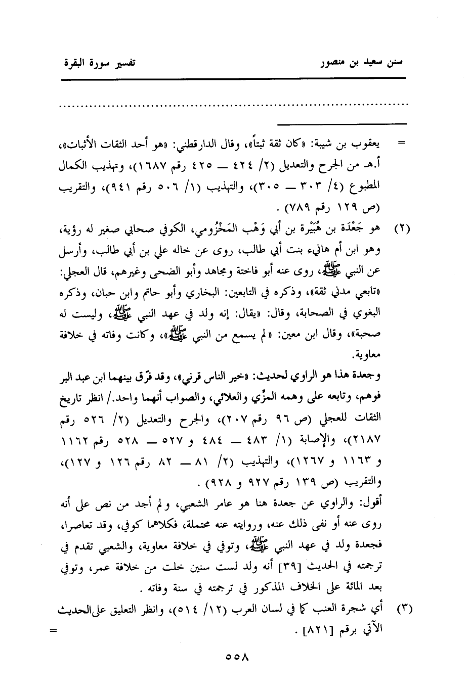 أقول: والراوي عن جعدة هنا هو عامر الشعبي، ولم أجد من نص على أنه روى عنه أو نفى ذلك عنه، وروايته عنه محتملة، فكلاهما كوفي، وقد تعاصرا، فجعدة ولد في عهد النَّبِيِّ - صَلَّى اللهُ عَلَيْهِ وَسَلَّمَ -، وتوفي في خلافة معاوية، والشعبي تقدم في ترجمته في الحديث [٣٩] أنه ولد لست سنين خلت من خلافة عمر، وتوفي بعد المائة على الخلاف المذكور في ترجمته في سنة وفاته.
