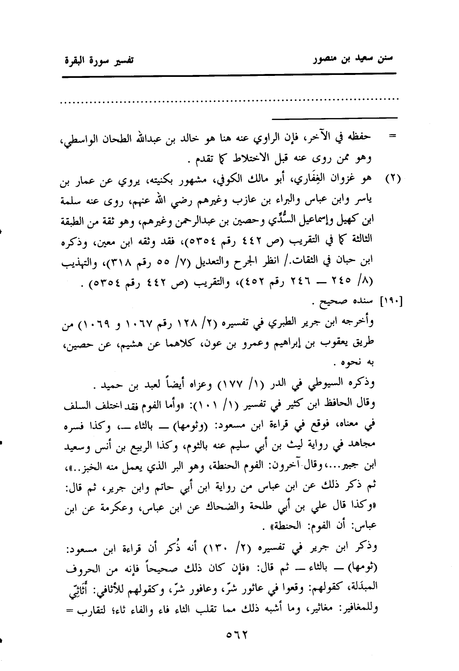 وقال الحافظ ابن كثير في "تفسيره" (١/ ١٠١): ((وأما الفوم فقد اختلف السلف في معناه، فوقع في قراءة ابن مسعود: (وثومها) - بالثاء -، وكذا فسره مجاهد في رواية ليث بن أبي سليم عنه بالثوم، وكذا الربيع بن أنس وسعيد بن جبير ... ، وقال آخرون: الفوم الحنطة، وهو البر الذي يعمل منه الخبز .... ))، ثم ذكر ذلك عن ابن عباس من رواية ابن أبي حاتم وابن جرير، ثم قال: ((وكذا قال علي بن أبي طلحة والضحاك عن ابن عباس، وعكرمة عن ابن عباس: أن الفوم: الحنطة)).
