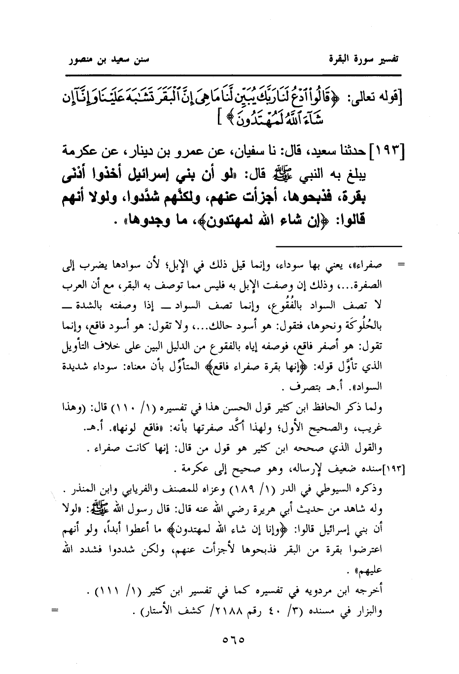 ١٩٣- حَدَّثَنَا سَعِيدٌ، قَالَ: نا سُفْيَانُ، عَنْ عَمْرِو بْنِ دِينَارٍ، عَنْ عِكْرِمَةَ، يَبْلُغُ بِهِ النَّبِيَّ صَلَّى اللهُ عَلَيْهِ وَسَلَّمَ قَالَ: ((لَوْ أَنَّ بَنِي إِسْرَائِيلَ أَخَذُوا أَدْنَى بَقَرَةٍ فَذَبَحُوهَا أَجْزَأَتْ عَنْهُمْ، ولكنَّهم شدَّدوا، وَلَوْلَا أَنَّهُمْ قَالُوا: {إِنْ شَاءَ اللهُ لَمُهْتَدُونَ} ما وجدوها)) .