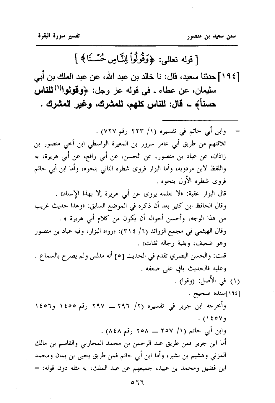 ١٩٤ - حَدَّثَنَا سَعِيدٌ؛ قَالَ: نا خَالِدُ بْنَ عَبْدِ اللَّهِ، عَنْ عَبْدِ الْمَلِكِ بْنِ أَبِي سُلَيْمَانَ، عَنْ عَطَاءٍ، فِي قَوْلِهِ عَزَّ وَجَلَّ: {وَقُولُوا (¬١) لِلنَّاسِ حُسْنًا} قَالَ: لِلنَّاسِ كُلِّهِمْ، لِلْمُشْرِكِ، وَغَيْرِ المشرك.