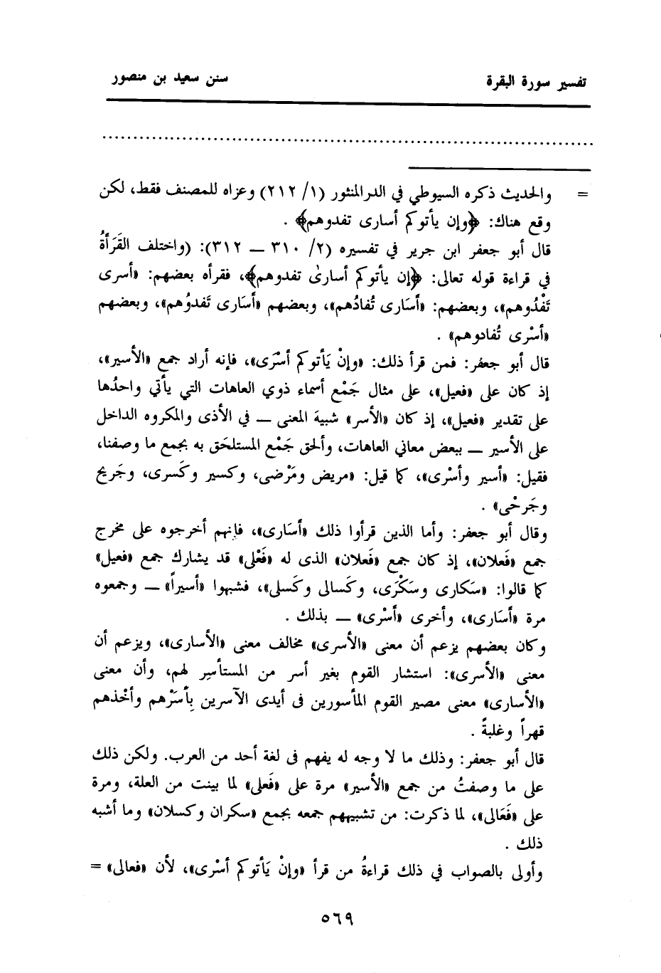 قال أبو جعفر: فمن قرأ ذلك: ((وإِنْ يَأتوكم أسْرَى)) ، فإنه أراد جمع ((الأسير)) ، إذ كان على ((فعيل)) ، على مثال جَمْع أسماء ذوي العاهات التي يأتي واحدُها على تقدير ((فعيل)) ، إذ كان ((الأسر)) شبيهَ المعنى - في الأذى والمكروه الداخل على الأسير - ببعض معاني العاهات، وألحق جَمْع المستلحَق به بجمع ما وصفنا، فقيل: ((أسير وأسْرى)) ، كما قيل: ((مريض ومَرْضى)) ، وكسير وكَسرى، وجَريح وجَرحْى)) .