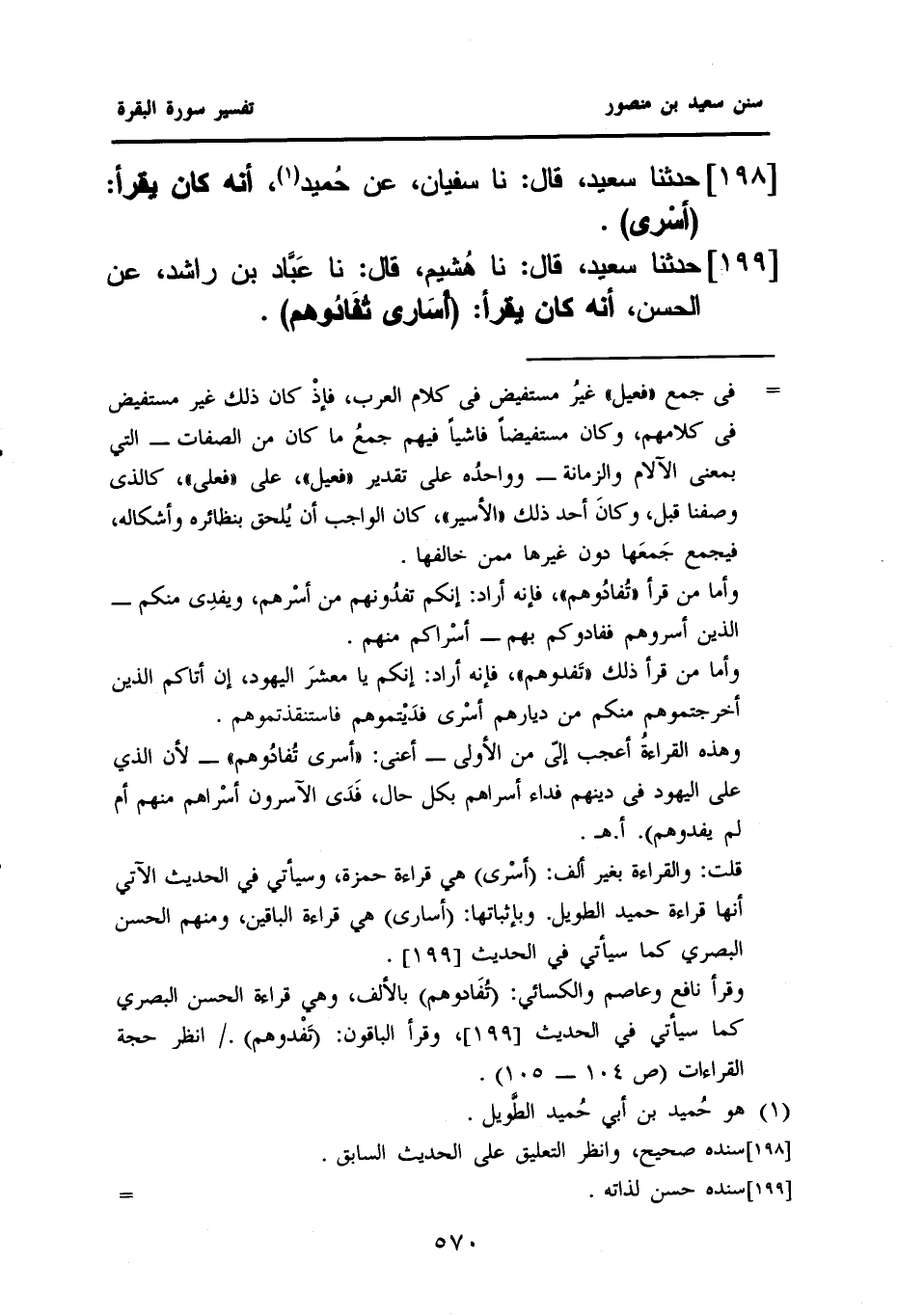 ١٩٨ - حَدَّثَنَا سَعِيدٌ، قَالَ: نا سُفْيَانُ، عَنْ حُميد (¬١)، أَنَّهُ كَانَ يَقْرَأُ: (أسْرى).