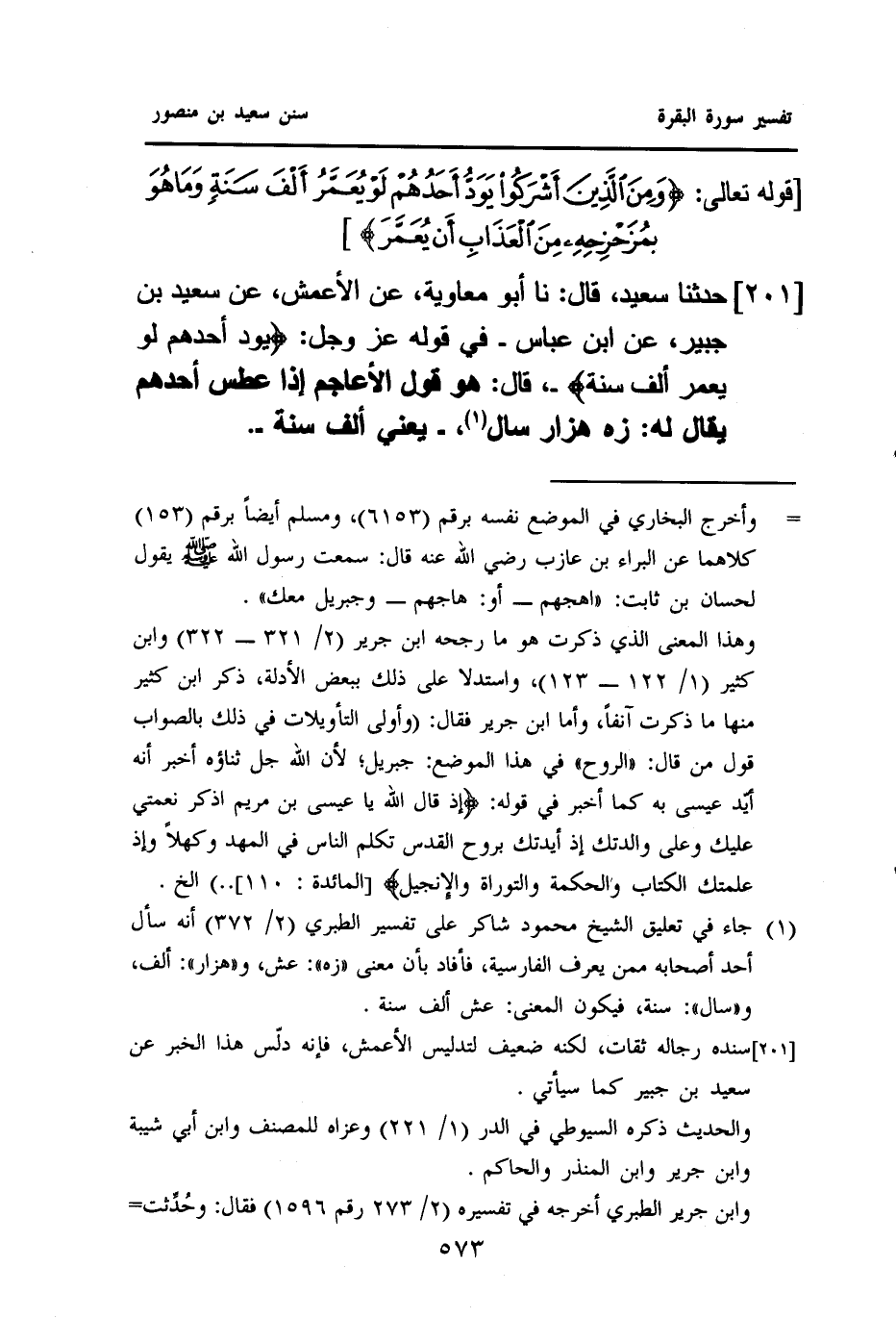 ٢٠١ - حَدَّثَنَا سَعِيدٌ، قَالَ: نا أَبُو مُعَاوِيَةَ، عَنِ الْأَعْمَشِ، عَنْ سَعِيدِ بْنِ جُبَيْرٍ، عَنِ ابْنِ عَبَّاسٍ، فِي قَوْلِهِ عَزَّ وَجَلَّ: {يَوَدُّ أَحَدُهُمْ لَوْ يُعَمَّرُ أَلْفَ سَنَةٍ}، قَالَ: هُوَ قَوْلُ الْأَعَاجِمِ إِذَا عَطِسَ أَحَدُهُمْ يُقَالُ لَهُ: زه هزار سال (¬١) - يَعْنِي: أَلْفَ سَنَةٍ -.
