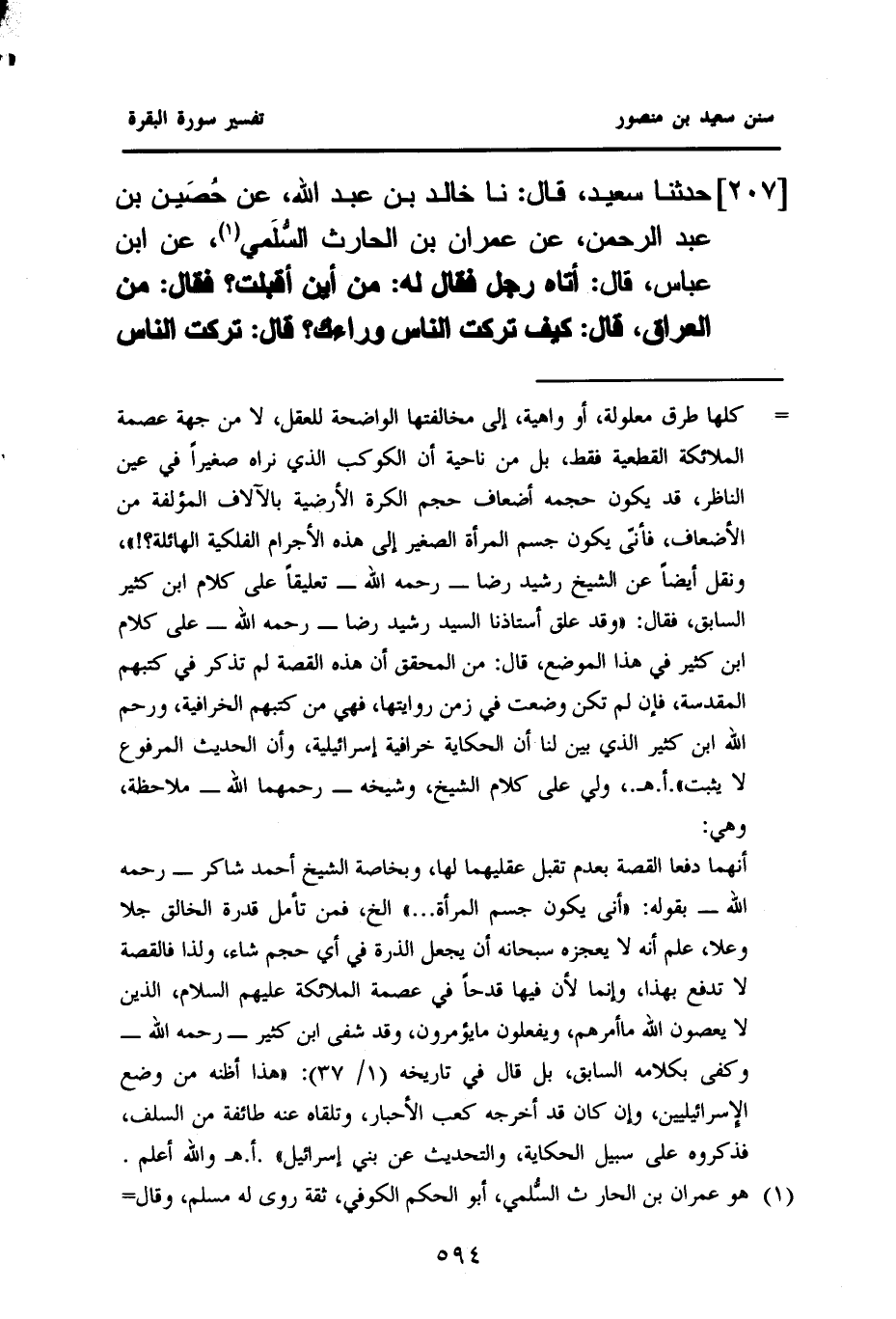 ٢٠٧ - حَدَّثَنَا سَعِيدٌ، قَالَ: نا خَالِدُ بْنُ عَبْدِ اللَّهِ، عَنْ حُصَين بْنِ عَبْدِ الرَّحْمَنِ، عَنْ عِمْرَانَ بْنِ حَارِثٍ السُّلَمي (¬١)، عَنِ ابْنِ عَبَّاسٍ قَالَ: أَتَاهُ رَجُلٌ فَقَالَ لَهُ: مِنْ أَيْنَ أَقْبَلْتَ؟ فَقَالَ: مِنَ الْعِرَاقِ، قَالَ: كَيْفَ تَرَكْتَ النَّاسَ وَرَاءَكَ؟ قَالَ: تَرَكْتُ النَّاسَ