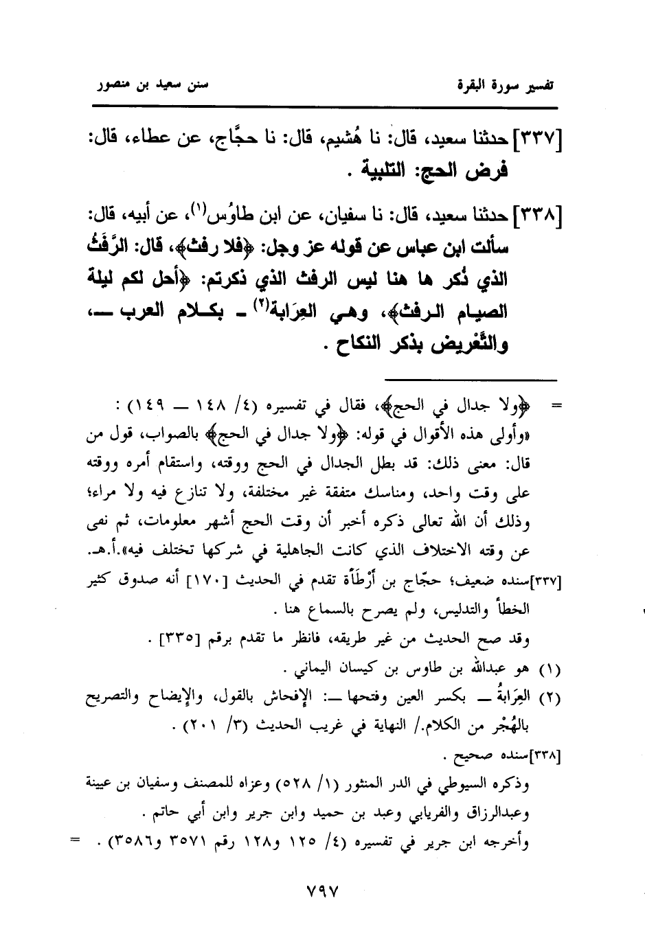 ٣٣٨ - حَدَّثَنَا سَعِيدٌ، قَالَ: نا سُفْيَانُ، عَنْ ابْنِ طاوُس (¬١)، عَنْ أَبِيهِ قَالَ: سَأَلْتُ ابْنَ عَبَّاسٍ، عَنْ قَوْلِهِ عز وجل: {فَلَا رَفَثَ}، قال: ((الرَّفَثُ الذي ذُكر ها هنا لَيْسَ الرَّفَثَ الَّذِي ذَكَرْتُمْ: {أُحِلَّ لَكُمْ لَيْلَةَ الصِّيَامِ الرَّفَثُ}، وَهِيَ العِرَابة (¬٢) - بِكَلَامِ الْعَرَبِ - والتَّعْريض بذكر النكاح)).