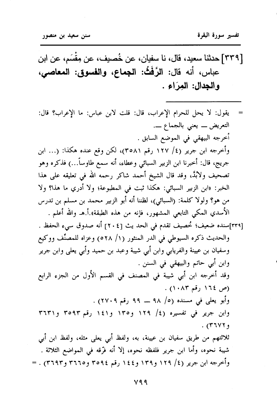 ٣٣٩- حَدَّثَنَا سَعِيدٌ، قَالَ: نا سُفْيَانُ، عَنْ خُصيف، عَنْ مِقْسَم، عَنِ ابْنِ عَبَّاسٍ، أَنَّهُ قَالَ: ((الرَّفَثُ: الْجِمَاعُ، وَالْفُسُوقُ: الْمَعَاصِي، وَالْجِدَالُ: المِرَاء)) .