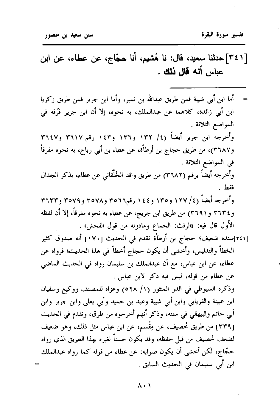 [٣٤١] سنده ضعيف؛ حجاج بن أرطأة تقدم في الحديث [١٧٠] أنه صدوق كثير الخطأ والتدليس، وأخشى أن يكون حجاج أخطأ في هذا الحديث؛ فرواه عَنْ عَطَاءٍ، عَنِ ابْنِ عَبَّاسٍ، مع أن عبد الملك بن سليمان رواه في الحديث الماضي، عن عطاء من قوله: ليس فيه ذكر لابن عباس.