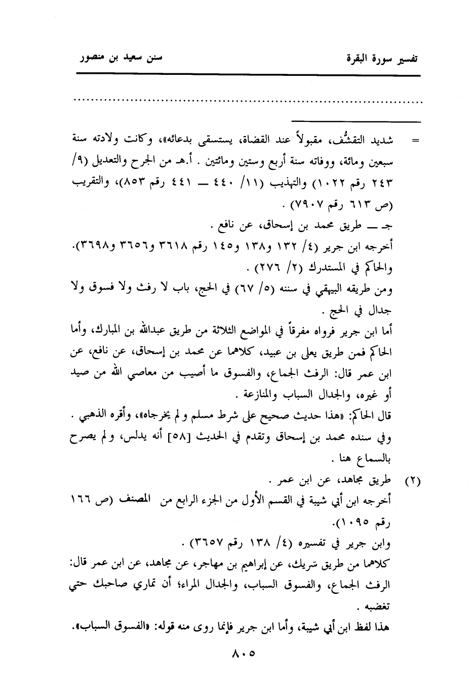 أما ابن جرير فرواه مفرقًا في المواضع الثلاثة من طريق عبد الله بن المبارك، وأما الحاكم فمن طريق يعلى بن عبيد، كلاهما عن محمد بن إسحاق، عَنْ نَافِعٍ، عَنِ ابْنِ عُمَرَ قال: الرفث الجماع، والفسوق ما أصيب من معاصي الله من صيد أو غيره، والجدال السباب والمنازعة.