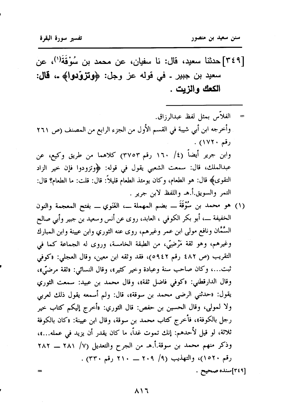 ٣٤٩ - حَدَّثَنَا سَعِيدٌ، قَالَ: نا سُفْيَانُ، عَنْ مُحَمَّدِ بْنِ سُوْقَةَ (¬١)، عَنْ سَعِيدِ بْنِ جُبَيْرٍ، - فِي قَوْلِهِ عز وجل: {وَتَزَوَّدُوا} -، قال: ((الكعك والزيت)).