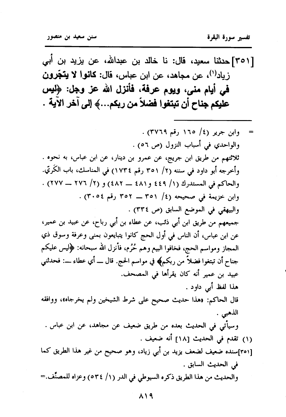٣٥١ - حَدَّثَنَا سَعِيدٌ، قَالَ: نا خَالِدُ بْنُ عَبْدِ اللَّهِ، عَنْ يَزِيدَ بْنِ أَبِي زِيَادٍ (¬١)، عَنْ مُجَاهِدٍ، عَنِ ابْنِ عَبَّاسٍ قَالَ: ((كَانُوا لَا يَتَّجِرُونَ فِي أَيَّامِ مِنًى، وَيَوْمِ عَرَفَةَ، فَأَنْزَلَ اللَّهُ عَزَّ وَجَلَّ: {لَيْسَ عَلَيْكُمْ جُنَاحٌ أَنْ تَبْتَغُوا فَضْلًا مِنْ رَبِّكُمْ ... } إلى آخر الآية)).