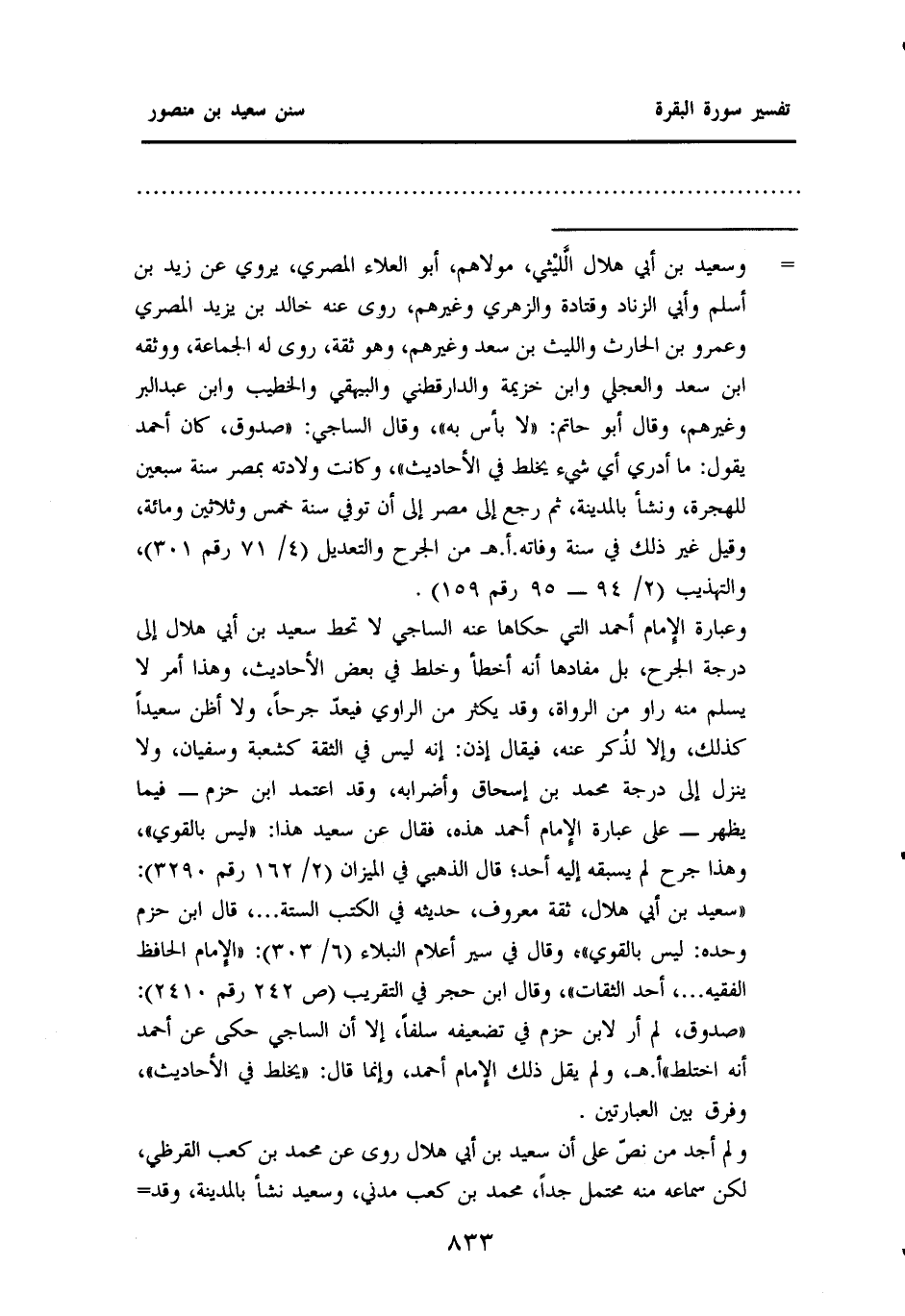 وعبارة الإمام أحمد التي حكاها عنه الساجي لا تحط سعيد بن أبي هلال إلى درجة الجرح، بل مفادها أنه أخطأ وخلط في بعض الأحاديث، وهذا أمر لا يسلم منه راو من الرواة، وقد يكثر من الراوي فيعدّ جرحًا، ولا أظن سعيدًا كذلك، وإلا لذُكر عنه، فيقال إذن: إنه ليس في الثقة كشعبة وسفيان، ولا ينزل إلى درجة محمد بن إسحاق وأضرابه، وقد اعتمد ابن حزم - فيما يظهر - على عبارة الإمام أحمد هذه، فقال عن سعيد هذا: ((ليس بالقوي)) ، وهذا جرح لم يسبقه إليه أحد؛ قال الذهبي في "الميزان" (٢ / ١٦٢ رقم ٣٢٩٠) : ((سعيد بن أبي هلال، ثقة معروف، حديثه في الكتب الستة ... ، قال ابن حزم وحده: ليس بالقوي)) ، وقال في "سير أعلام النبلاء" (٦ / ٣٠٣) : ((الإمام الحافظ الفقيه ... ، أحد الثقات)) ، وقال ابن حجر في "التقريب" (ص٢٤٢ رقم ٢٤١٠) : ((صدوق، لم أر لابن حزم في تضعيفه سلفًا، إلا أن الساجي حكى عن أحمد أنه اختلط)) . اهـ. ولم يقل ذلك الإمام أحمد، وإنما قال: ((يخلط في الأحاديث)) ، وفرق بين العبارتين.
