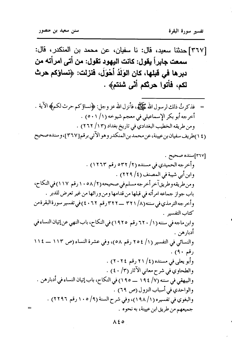 ٣٦٧- حَدَّثَنَا سَعِيدٌ، قَالَ: نا سُفْيَانُ، عَنْ مُحَمَّدِ بْنِ الْمُنْكَدِرِ، قَالَ: سَمِعْتُ جَابِرًا يَقُولُ: ((كَانَتِ الْيَهُودُ تَقُولُ: مَنْ أَتَى امْرَأَتَهُ مِنْ دُبُرِهَا فِي قُبُلِهَا، كَانَ الوَلَدُ أَحْوَلَ، فَنَزَلَتْ: {نِسَاؤُكُمْ حَرْثٌ لَكُمْ فَأْتُوا حَرْثَكُمْ أَنَّى شِئْتُمْ} )) .