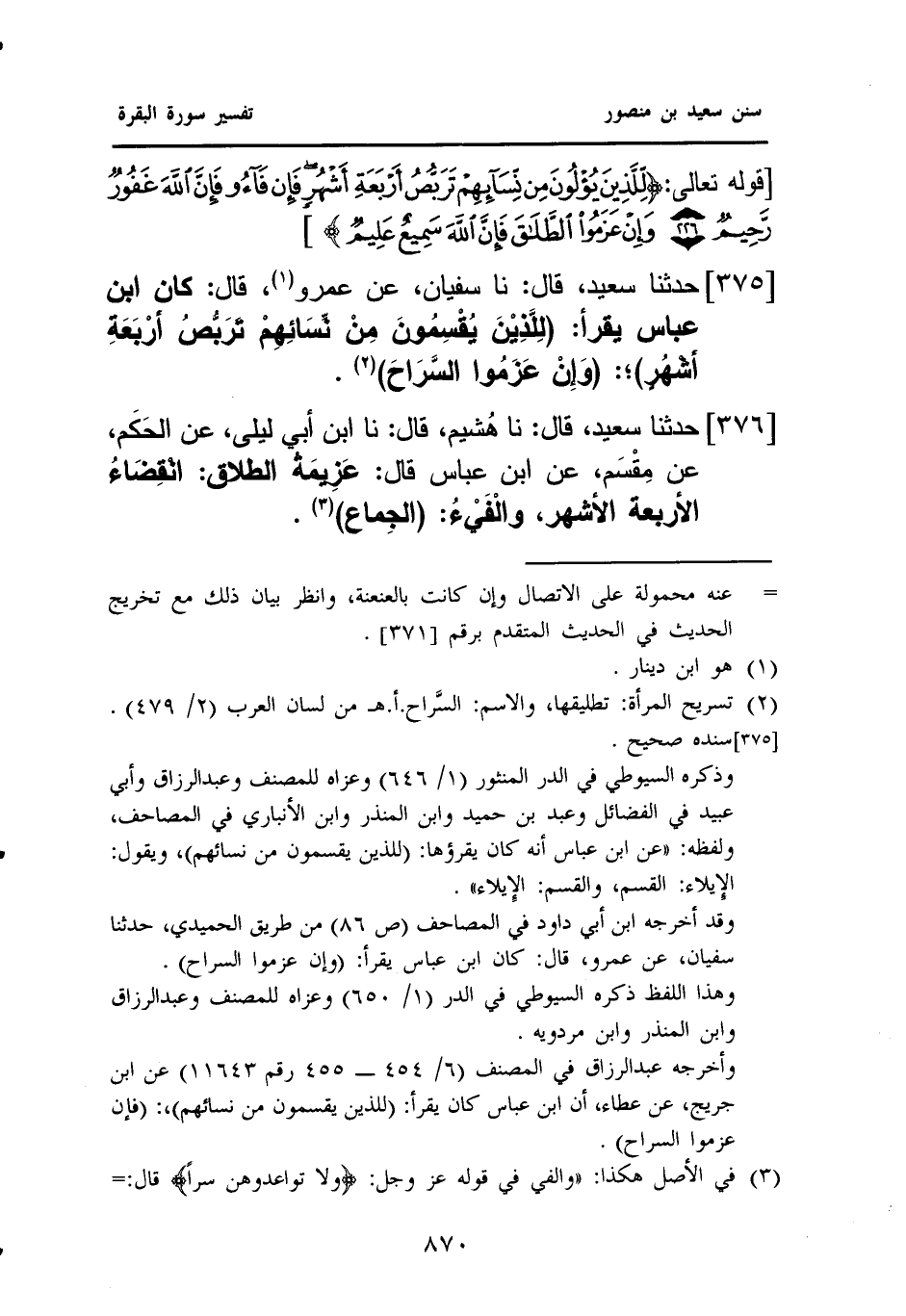 ٣٧٥ - حَدَّثَنَا سَعِيدٌ، قَالَ: نَا سُفْيَانُ، عَنْ عَمْرٍو (¬١)، قَالَ: كَانَ ابْنُ عَبَّاسٍ يَقْرَأُ: (لِلَّذِيْنَ يُقْسِمُونَ مِنْ نَسَائِهِمْ تَرَبُّصُ أَرْبَعَةِ أَشْهُرٍ)؛ (وَإِنْ عَزَمُوا السَّرَاحَ) (¬٢))).