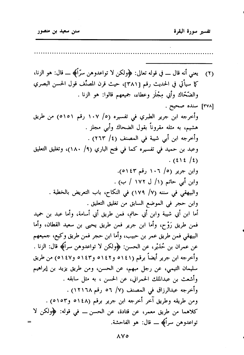 أما ابن أبي شيبة وابن أبي حاتم، فمن طريق أبي أسامة، وأما عبد بن حميد فمن طريق رَوْح، وأما ابن جرير فمن طريق يحيى بن سعيد القطان، وأما البيهقي فمن طريق عمر بن حبيب، وأما ابن حجر فمن طريق وكيع، جميعهم عَنْ عِمْرَانَ بْنِ حُدَيْر، عَنْ الحسن: {وَلَكِنْ لَا تُوَاعِدُوهُنَّ سِرًّا} قال: الزنا.