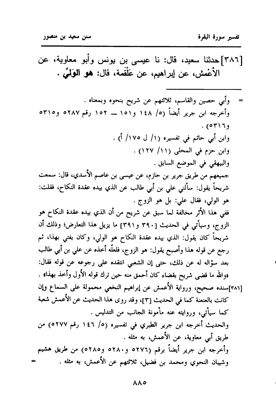 ٣٨٦- حَدَّثَنَا سَعِيدٌ، قَالَ: نا عِيسَى بْنُ يُونُسَ وَأَبُو مُعَاوِيَةَ، عَنِ الأَعْمش، عَنْ إِبْرَاهِيمَ، عَنْ عَلْقَمة، قال: ((هو الوَليِّ)) .