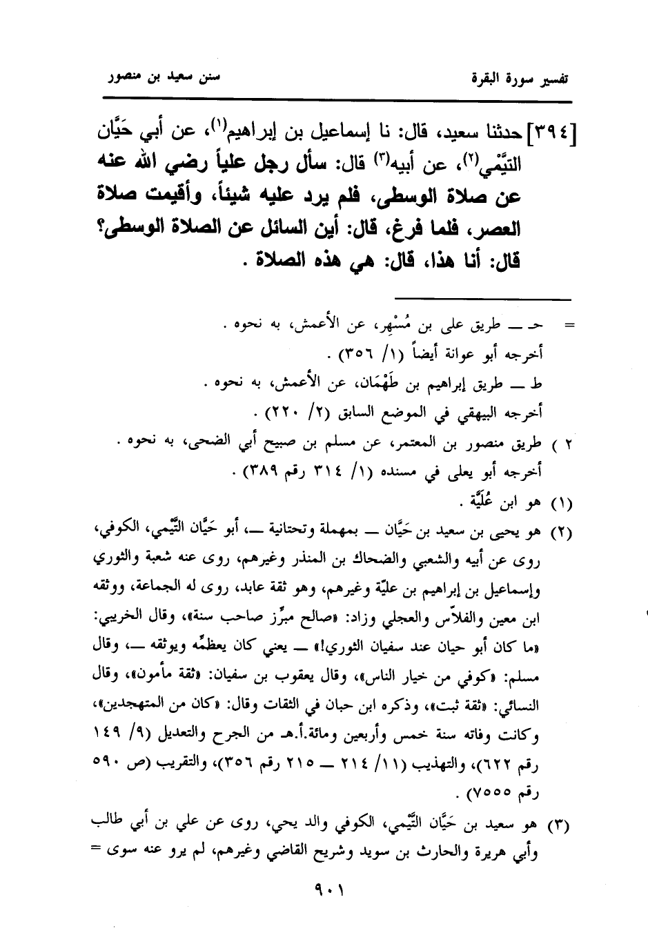 ٣٩٤ - حَدَّثَنَا سَعِيدٌ، قَالَ: نا إِسْمَاعِيلُ بْنُ إِبْرَاهِيمَ (¬١)، عَنْ أَبِي حَيَّان التَّيْمي (¬٢)، عَنْ أَبِيهِ (¬٣)، قَالَ: سَأَلَ رَجُلٌ عَلِيًّا - رَضِيَ اللَّهُ عَنْهُ - عَنْ صَلَاةِ الْوُسْطَى، فَلَمْ يَرُدَّ عَلَيْهِ شَيْئًا، وَأُقِيمَتْ صَلَاةُ الْعَصْرِ، فَلَمَّا فَرَغَ، قَالَ: ((أَيْنَ السَّائِلُ عَنِ الصَّلَاةِ الْوُسْطَى؟)) قَالَ: أَنَا هَذَا. قَالَ: ((هِيَ هَذِهِ الصَّلَاةُ)).