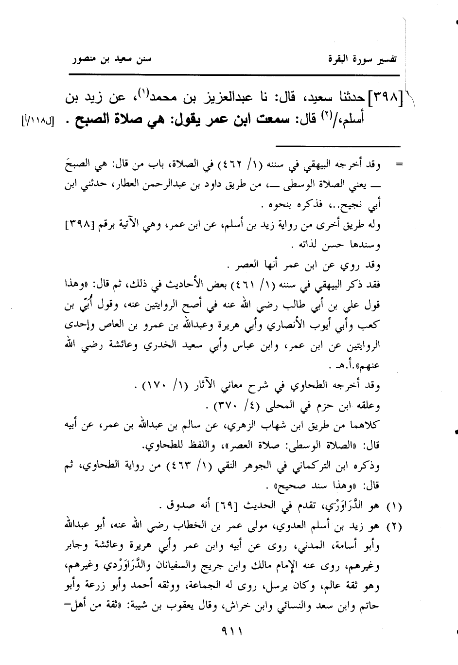 ٣٩٨ - حَدَّثَنَا سَعِيدٌ، قَالَ: نا عَبْدُ الْعَزِيزِ بْنُ مُحَمَّدٍ (¬١)، عَنْ زَيْدِ بن أسلم، [ل ١١٨/أ] (¬٢) قَالَ: سَمِعْتُ ابْنَ عُمَرَ يَقُولُ: ((هي صلاة الصبح)).