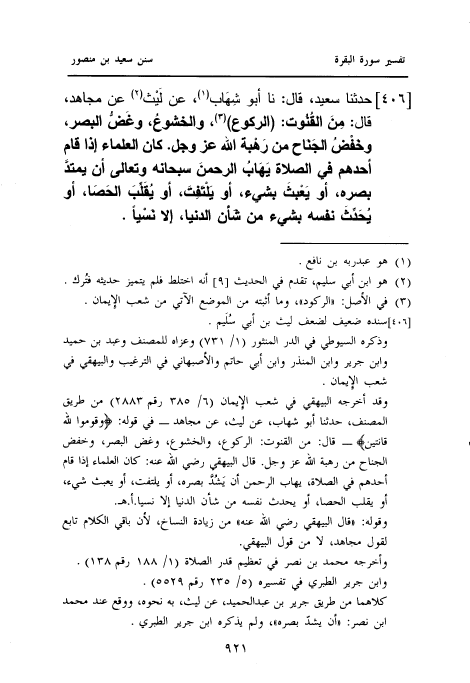 ٤٠٦ - حَدَّثَنَا سَعِيدٌ، قَالَ: نا أَبُو شِهَاب (¬١)، عَنْ لَيْث (¬٢)، عَنْ مُجَاهِدٍ، قَالَ: ((مِنَ القُنُوت: (الرُّكُوعُ) (¬٣)، والخشوعُ، وغَضُّ الْبَصَرِ، وخفْضُ الجَنَاح مِنْ رَهْبة اللَّهِ - عَزَّ وَجَلَّ -، كَانَ الْعُلَمَاءُ إِذَا قَامَ أَحَدُهُمْ فِي الصَّلَاةِ، يَهَابُ الرحمنَ - سُبْحَانَهُ وَتَعَالَى - أَنْ يمتدَّ بَصَرُهُ، أَوْ يَعْبثَ بِشَيْءٍ، أَوْ يَلْتَفِتَ، أَوْ يُقَلِّبَ الحَصَا، أَوْ يُحَدِّثَ نَفْسَهُ بِشَيْءٍ مِنْ شَأْن الدُّنْيَا، إِلَّا نَسْيًا)).