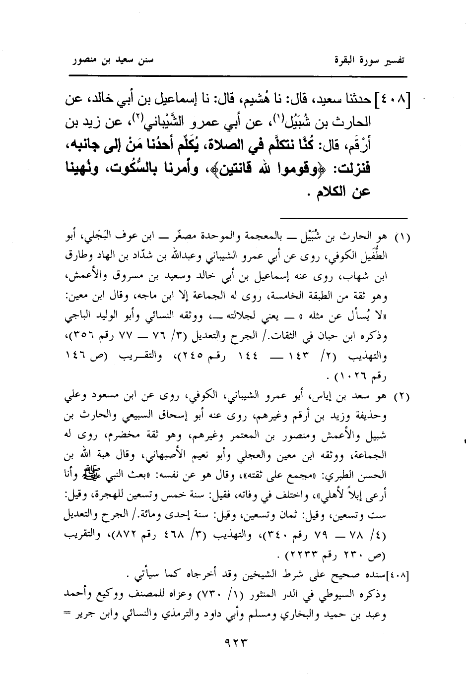 ٤٠٨ - حَدَّثَنَا سَعِيدٌ، قَالَ: نا هُشيم، قَالَ: نا إِسْمَاعِيلُ بْنُ أَبِي خَالِدٍ، عَنِ الْحَارِثِ بْنِ شُبَيُل (¬١)، عَنْ أَبِي عَمْرٍو الشَّيْباني (¬٢)، عَنْ زَيْدِ بْنِ أَرْقَم قَالَ: ((كُنَّا نتكلَّم فِي الصَّلَاةِ، يُكَلِّم أحدُنا مَنْ إِلَى جَانِبِهِ))، فَنَزَلَتْ: {وَقُومُوا للهِ قَانِتِينَ} وَأُمِرْنَا بالسُّكُوت، ونُهينا عَنِ الْكَلَامِ.
