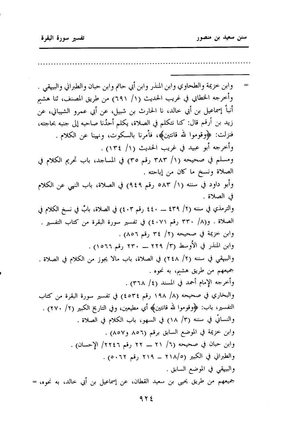 وأخرجه الخطابي في "غريب الحديث" (١ / ٦٩١) من طريق المصنف، ثنا هشيم أنبأ إسماعيل بن أبي خالد، نا الْحَارِثِ بْنِ شُبَيْلٍ، عَنْ أَبِي عَمْرٍو الشَّيْبَانِيِّ، عَنْ زَيْدِ بْنِ أَرْقَمَ قَالَ: كُنَّا نَتَكَلَّمُ فِي الصلاة، يكلم أحدُنا صاحبه إلى جنبه بحاجته، فنزلت: {وَقُومُوا للهِ قَانِتِينَ} ، فأمرنا بالسكوت، ونهينا عن الكلام.