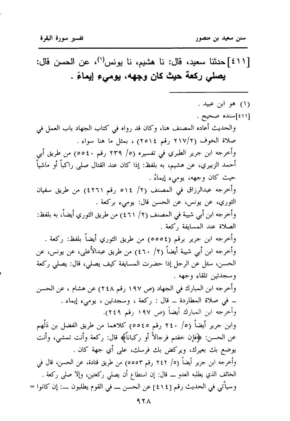 ٤١١ - حَدَّثَنَا سَعِيدٌ، قَالَ: نا هُشَيْمٌ، نَا يُونُسُ (¬١)، عَنِ الْحَسَنِ قَالَ: ((يُصَلِّي رَكْعَةً حَيْثُ كَانَ وَجْهُهُ، يومئ إيماءً)).
