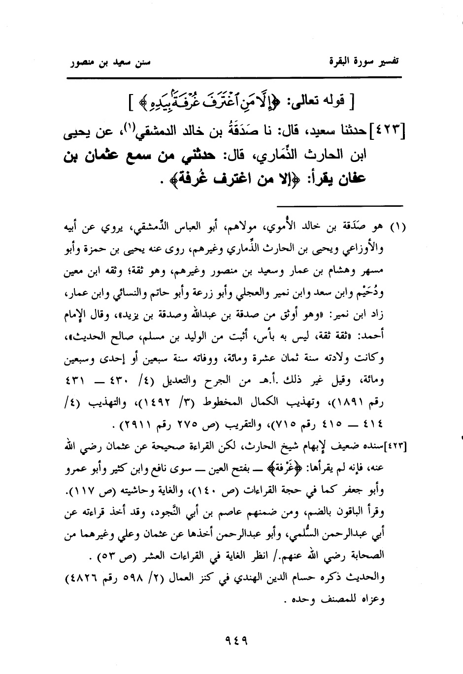 ٤٢٣ - حَدَّثَنَا سَعِيدٌ، قَالَ: نَا صَدَقَةُ بْنُ خَالِدٍ الدِّمَشْقِيُّ (¬١)، عَنْ يَحْيَى بْنِ حَارِثٍ الذِّمَاري قَالَ: حَدَّثَنِي مَنْ سَمِعَ عُثْمَانَ بْنَ عَفَّانَ يَقْرَأُ: {إِلَّا مَنِ اغْتَرَفَ غُرْفَةً}.