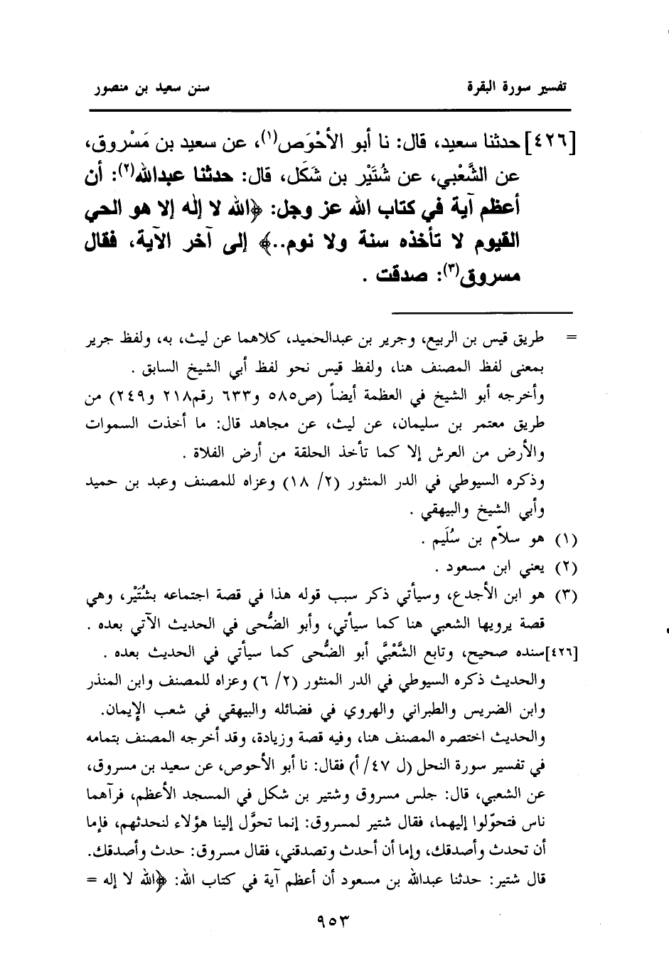 ٤٢٦ - حَدَّثَنَا سَعِيدٌ، قَالَ: نا أَبُو الأحْوَص (¬١)، عَنْ سَعِيدِ بْنِ مَسْروق، عَنِ الشَّعْبي، عَنْ شُتَيْر بْنِ شَكَل، قَالَ: حَدَّثَنَا عَبْدُ اللَّهِ (¬٢): أَنَّ أَعْظَمَ آيَةٍ فِي كِتَابِ اللَّهِ عَزَّ وَجَلَّ: {اللهُ لَا إِلَهَ إِلَّا هُوَ الحَيُّ القَيُّومُ لَا تَأْخُذُهُ سِنَةٌ وَلَا نَوْمٌ ... } إِلَى آخِرِ الْآيَةِ فَقَالَ مَسْرُوقٌ (¬٣): صدقت.