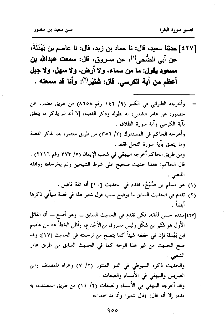 ٢٤٧ - حَدَّثَنَا سَعِيدٌ، قَالَ: نا حَمَّادُ بْنُ زَيْدٍ، قَالَ: نا عَاصِمُ بْنُ بَهْدَلَةَ، عَنْ أَبِي الضُّحى (¬١)، عَنْ مَسْرُوقٍ، قَالَ: سَمِعْتُ عَبْدَ اللَّهِ بْنَ مَسْعُودٍ يَقُولُ: مَا مِنْ سَمَاءٍ، وَلَا أَرْضٍ، وَلَا سَهْلٍ، وَلَا جَبَلٍ، أَعْظَمُ مِنْ آيَةِ الْكُرْسِيِّ. قَالَ شُتَيْر (¬٢): وَأَنَا قد سمعته.