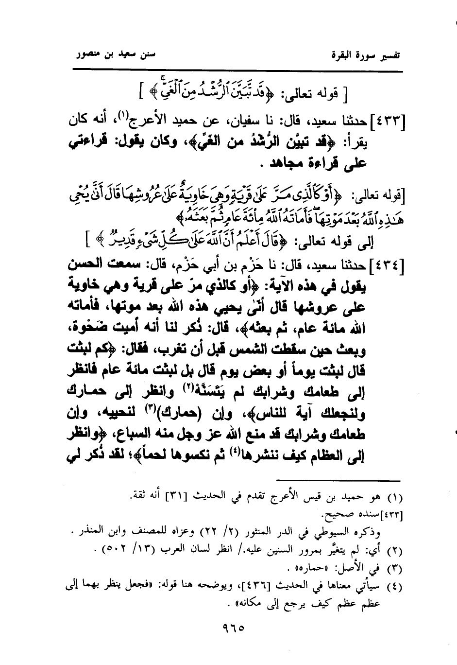 ٤٣٤ - حَدَّثَنَا سَعِيدٌ، قَالَ: نا حَزْم بْنُ أَبِي حَزْم، قَالَ: سَمِعْتُ الْحَسَنَ يَقُولُ فِي هَذِهِ الْآيَةِ: {أَوْ كَالَّذِي مَرَّ عَلَى قَرْيَةٍ وَهِيَ خَاوِيَةٌ عَلَى عُرُوشِهَا قَالَ أَنَّى يُحْيِي هَذِهِ اللهُ بَعْدَ مَوْتِهَا فَأَمَاتَهُ اللهُ مِئَةَ عَامٍ ثُمَّ بَعَثَهُ}، قَالَ: ذُكر لَنَا أَنَّهُ أُمِيتَ ضَحْوة، وَبُعِثَ حِينَ سَقَطَتِ الشَّمْسُ قَبْلَ أَنْ تَغْرُبَ، فَقَالَ: {كَمْ لَبِثْتَ قَالَ لَبِثْتُ يَوْمًا أَوْ بَعْضَ يَوْمٍ قَالَ بَلْ لَبِثْتَ مِئَةَ عَامٍ فَانْظُرْ إِلَى طَعَامِكَ وَشَرَابِكَ لَمْ يَتَسَنَّهْ (¬٢) وَانْظُرْ إِلَى حِمَارِكَ وَلِنَجْعَلَكَ آيَةً لِلنَّاسِ}، وَإِنَّ (حِمَارَكَ) (¬٣) لَنُحْيِيهِ، وَإِنَّ طَعَامَكَ وَشَرَابَكَ، قَدْ مَنَعَ اللَّهُ - عَزَّ وَجَلَّ - مِنْهُ السِّبَاعَ {وَانْظُرْ إِلَى العِظَامِ كَيْفَ نُنْشِزُهَا (¬٤) ثُمَّ نَكْسُوهَا لَحْمًا}؛ لقد ذُكر لي
