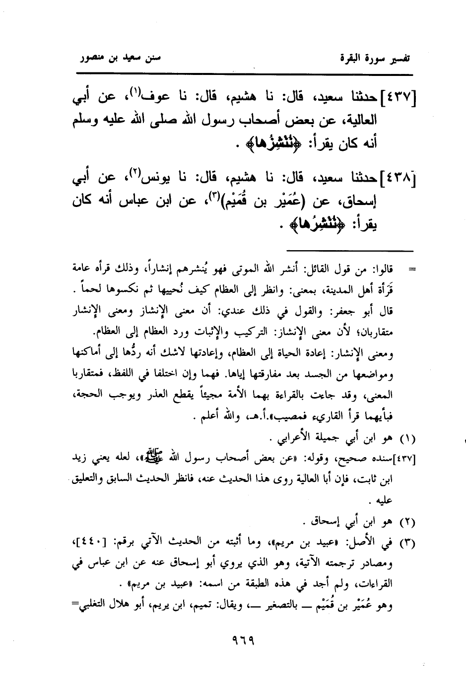 ٤٣٨ - حَدَّثَنَا سَعِيدٌ، قَالَ: نا هُشَيْمٌ، قَالَ: نَا يُونُسُ (¬٢)، عَنْ أَبِي إِسْحَاقَ، عَنْ (عُمَيْر بْنِ قُمَيْم) (¬٣)، عَنِ ابْنِ عَبَّاسٍ، أَنَّهُ كَانَ يقرأ: {نُنْشِرُها}