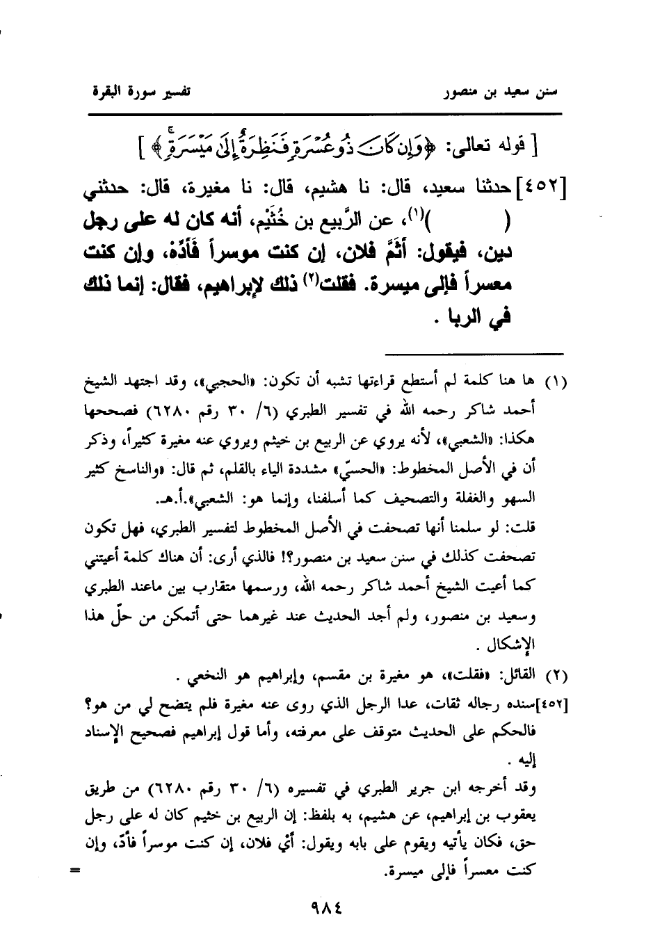 ٤٥٢ - حَدَّثَنَا سَعِيدٌ، قَالَ: نا هُشَيْمٌ، قَالَ: نَا مُغِيرَةُ قَالَ: حَدَّثَنِي ( ... ... ) (¬١)، عَنِ الرَّبيع بْنِ خُثَيْم، أَنَّهُ كَانَ لَهُ عَلَى رَجُلٍ دَيْنٌ، فَيَقُولُ: أَثَمَّ فُلَانٌ، إِنْ كُنْتَ مُوسِرًا فَأَدِّهْ، وَإِنْ كُنْتَ مُعْسِرًا فَإِلَى مَيْسَرَةٍ. فَقُلْتُ (¬٢) ذَلِكَ لِإِبْرَاهِيمَ، فَقَالَ: إِنَّمَا ذَلِكَ فِي الرِّبَا.