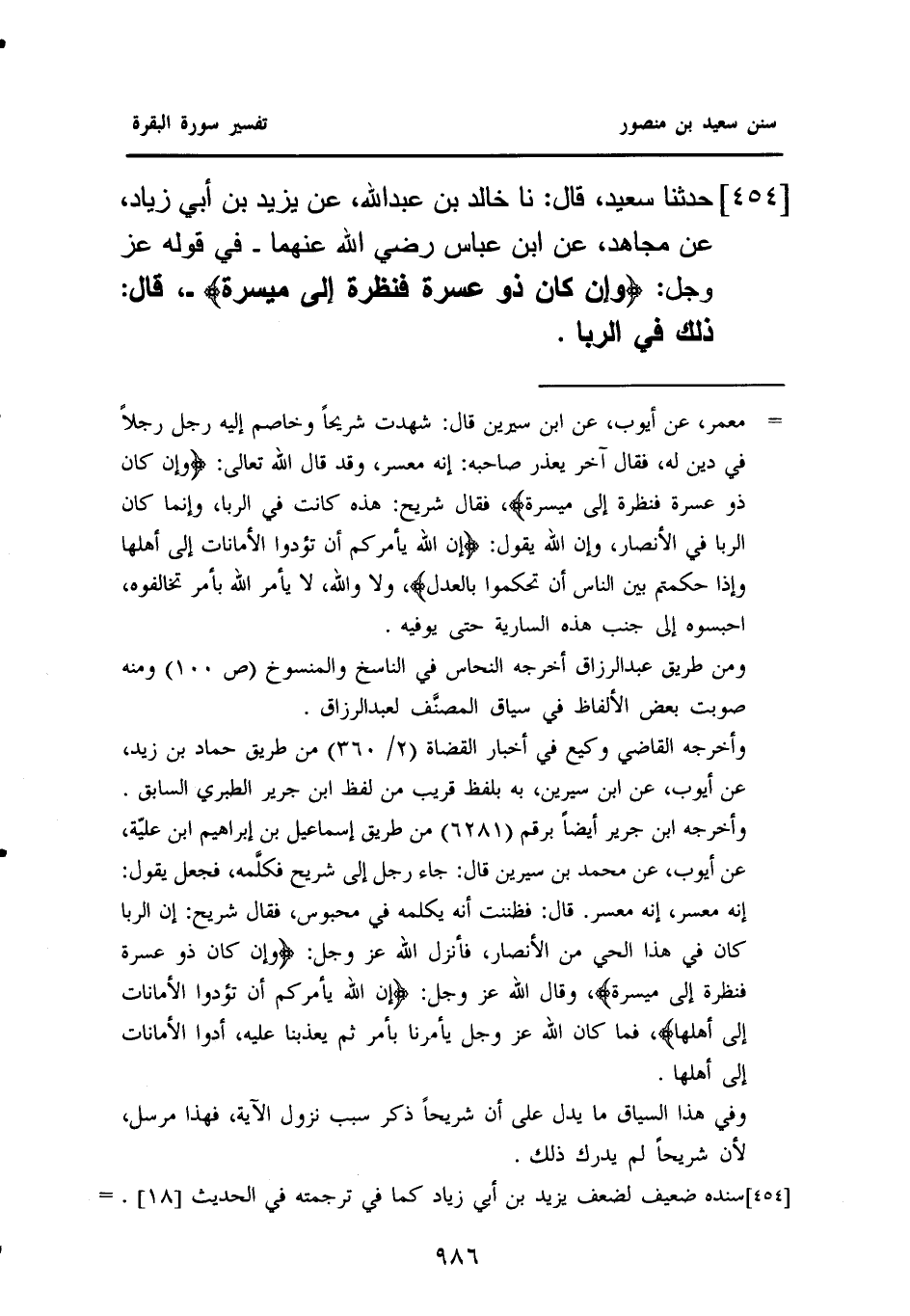 ٤٥٤- حَدَّثَنَا سَعِيدٌ، قَالَ: نا خَالِدُ بْنُ عَبْدِ اللَّهِ، عَنْ يَزِيدَ بْنِ أَبِي زِيَادٍ، عَنْ مُجَاهِدٍ، عَنِ ابْنِ عَبَّاسٍ - رَضِيَ اللَّهُ عَنْهُمَا - - فِي قَوْلِهِ عَزَّ وَجَلَّ: {وَإِنْ كَانَ ذُو عُسْرَةٍ فَنَظِرَةٌ إِلَى مَيْسَرَةٍ} -، قال: ذلك في الربا.